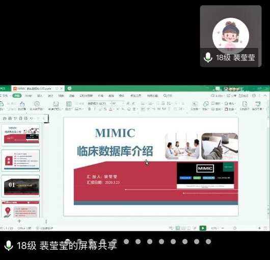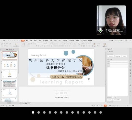 会议由BEAT365英国官网党委副书记王秀红主持。本次读书报告会共分两个环节进行,首先由2017级方雯、覃瑛、张凡、李晓杰4位同学汇报了课题进展及学位论文完成情况,同学们结合自身完成课题和学位论文撰写过程中的经验和体会做了分享和交流。随后导师和同学对4位同学的汇报进行了点评。接下来的环节,2018级研究生张丽娟和裴莹莹分别以PPT形式进行了15分钟的读书报告汇报。张丽娟以“冰山理论”为题,分享了冰山理论核心观点及在护理研究领域的应用,裴莹莹以“MIMIC数据库介绍”为题,较为系统介绍了MIMIC数据库的使用。导师们根据学生的综合表现进行线上面对面点评,同时通过问卷星对学生汇报内容就选择意义、内容掌握、延伸拓展等方面进行综合考评,作为研究生培养学术综合成绩评定参考。