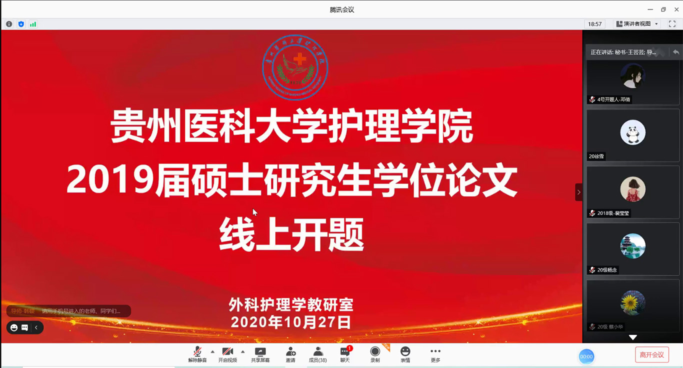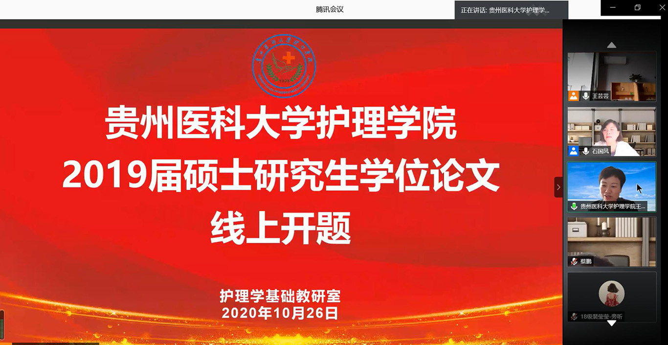 10月26日-27日,BEAT365英国官网2019级硕士研究生第一批集中开题通过腾讯会议平台在线进行,护理学基础教研室3名研究生和外科护理学教研室4名研究生