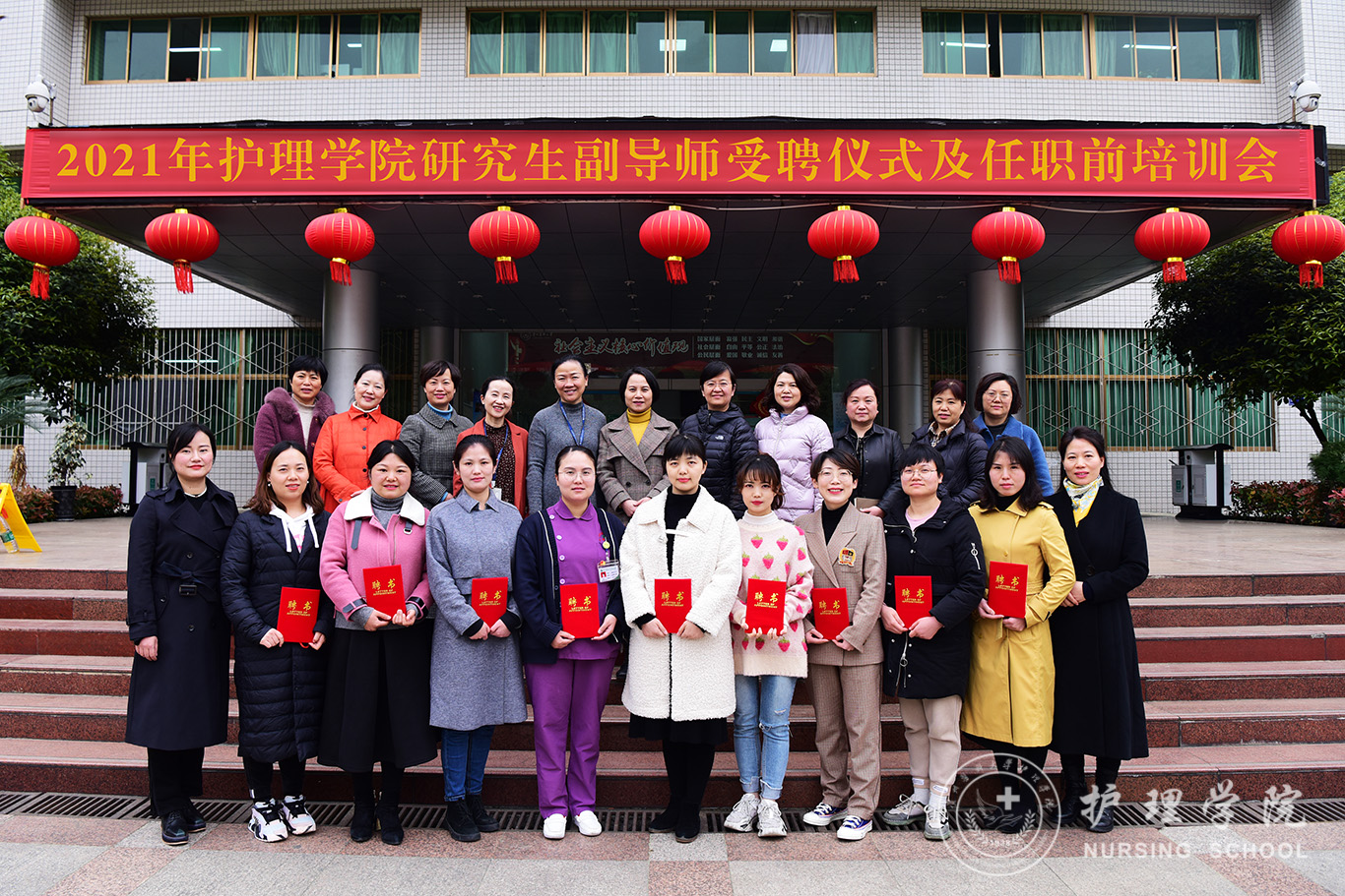 受聘仪式开始前王秀红介绍我院研究生副导师遴选工作的开展过程和情况。随后,刘志燕宣读副导师名单,杨英、李亚玲为副导师颁发聘书。赵雪作为副导师代表讲话并表态,一定会珍惜宝贵的锻炼机会,加强自身学习和建设,认真配合好导师工作,为培养出高质量的硕士研究生而努力。附属医院护理部副主任蔡鹏代表导师发言,她对副导师的加入表示热烈的欢迎和深切的期待,希望副导师充分发挥科研特长和专业特长,大胆工作,与导师一起携手把研究生培养好。李亚玲讲到副导师作为新生力量的注入,要充分积极发挥自身在科研、教学、专业等方面的优势,不断学习,互帮互补,快速成长,为促进护理学科高质量发展起到承上启下的重要职责和作用。杨英讲到副导师的遴选和加入,开启了我校护理学科发展的新起点,她勉励在座的教师要不断增强使命感、责任感,以身作则,落实立德树人的根本任务,勤奋创新、虚心学习,促进护理学科高质量发展。受聘仪式后全体参会人员在行政楼前合影。