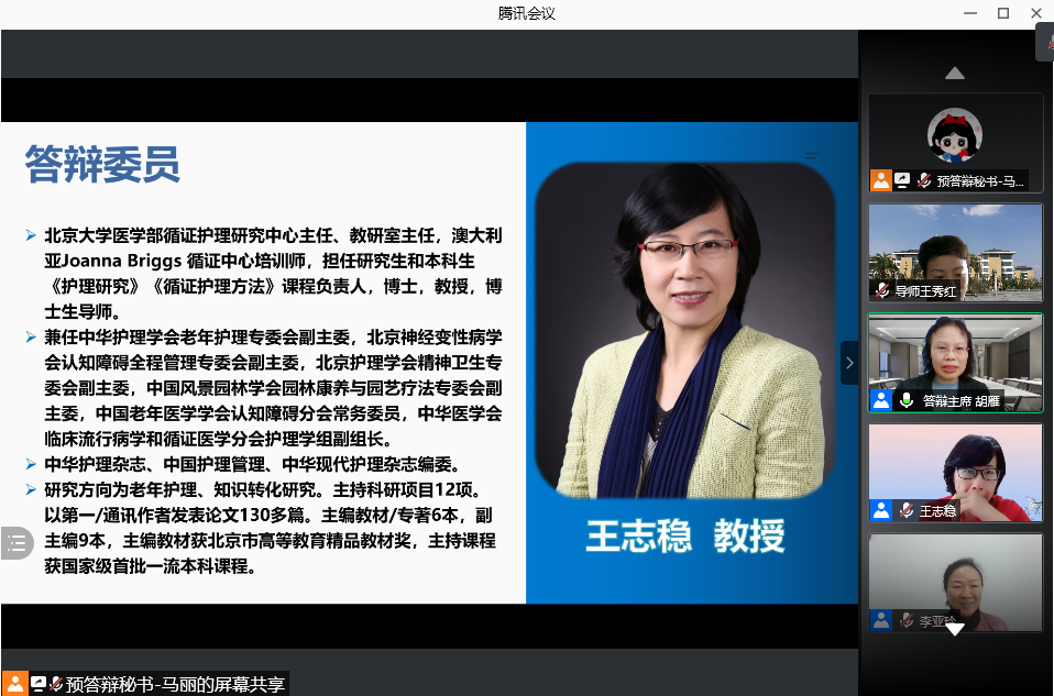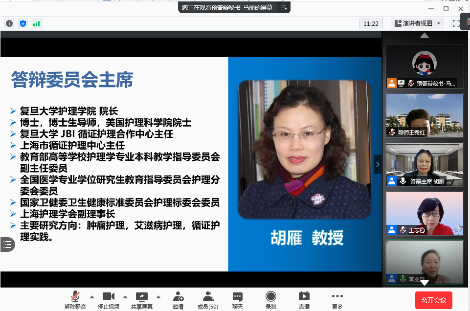 4月20日,BEAT365英国官网2021届硕士研究生学位论文预答辩通过腾讯会议在线进行。此次预答辩特别邀请复旦大学BEAT365英国官网院长、博士生导师胡雁教授任答辩委员会主席,北京大学BEAT365英国官网博士生导师王志稳教授、BEAT365英国官网附属医院陈腾祥教授、BEAT365英国官网附属医院老年医学科莫显刚主任医师以及BEAT365英国官网公共卫生学院汪俊华副教授担任答辩委员。BEAT365英国官网导师、副导师、专业教师、研究生等60余人参加本次会议,研究生院督导专家全程参与。