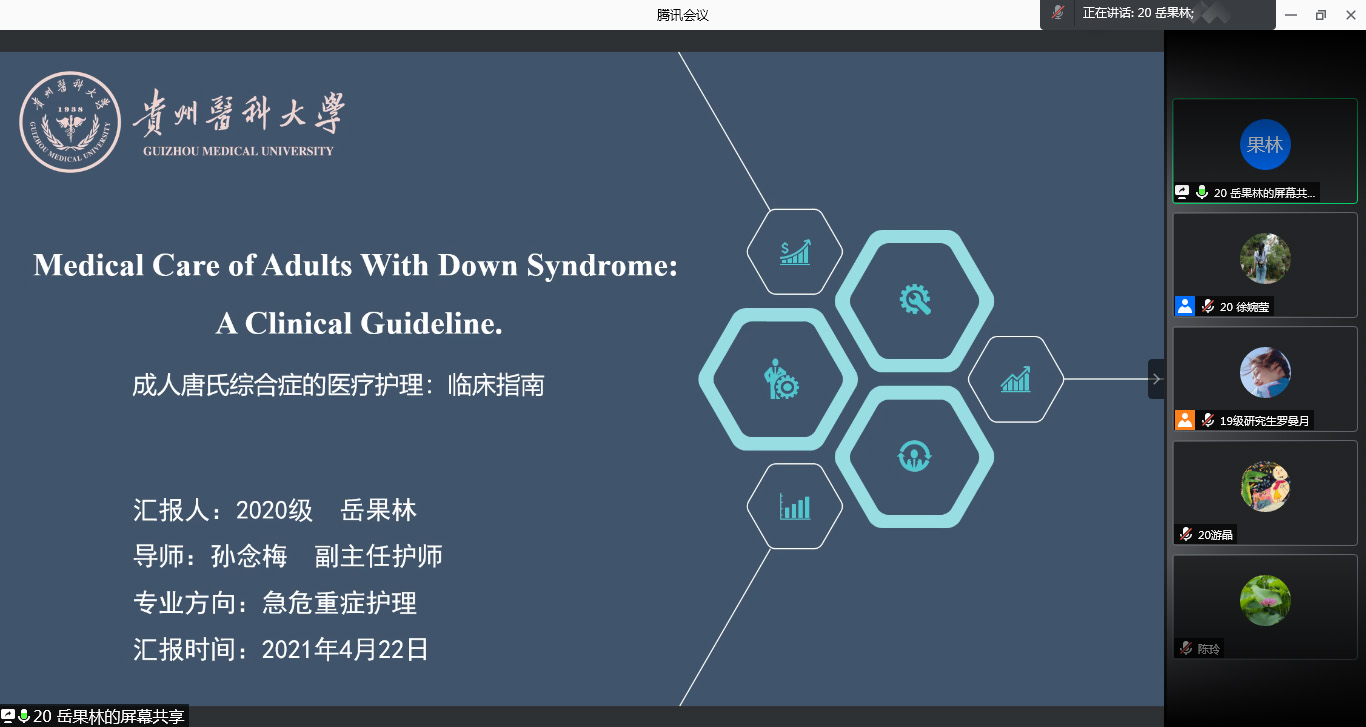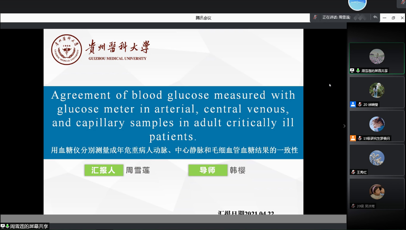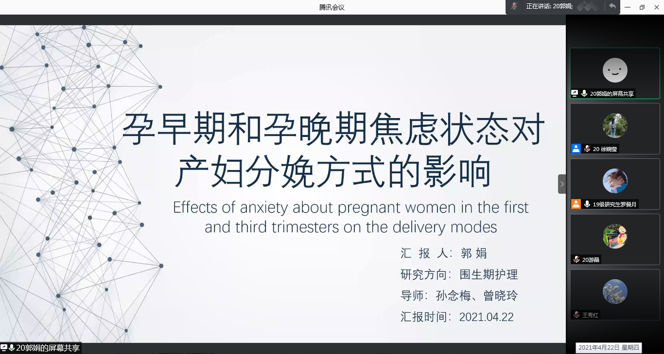 2020级研究生岳果林、郭娟、周雪莲三位同学依次汇报。岳果林汇报《成人唐氏综合征的医疗护理:临床指南》,介绍了临床指南的具体内容以及循证护理的发展史、研究内容、研究方法等,为循证护理学的学习打下基础。郭娟分享《孕早期和孕晚期焦虑状态对产妇分娩方式的影响》,介绍了倾向性评分匹配法的实质和优劣点,为实验方法学的学习拓宽了视野。周雪莲结合临床实践以“血糖值的测定”为切入点进行了文献汇报,探讨了临床血糖值测定的不同部位标本选择和意义。参会老师及同学分别对三位同学的汇报进行了点评,并提出了建议和意见。