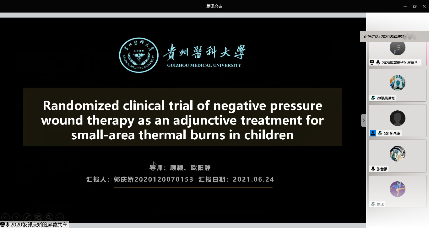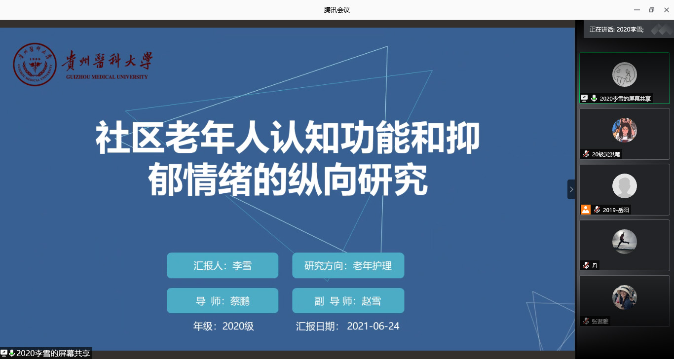 2020级研究生李雪、张茜雅、郭庆娇三位同学依次汇报。李雪汇报《社区老年人认知功能和抑郁情绪的纵向研究》,文章介绍了社区护理与实验心理学相结合对老年人抑郁情绪和认知功能的研究效果,汇报人从研究方法、统计学和模型构建三方面来充分阐述,并分享了学习心得。张茜雅分享了《乳腺癌手术患者绘画训练主导的功能锻炼研究》,介绍曼陀罗绘画和功能锻炼相结合的功能锻炼方法对乳腺癌患者的内心状况的影响。郭庆娇汇报《负压创面疗法辅助治疗儿童小面积烧伤的随机临床试验》,重点讲述了该研究通过融合负二项回归分析、亚组分析、泊松回归模型、混合效应模型、敏感性分析及风险预测模型等多种统计分析方法,探讨标准ActicoatTM、MepitelTM敷料联合NPWT治疗儿童小面积烧伤的疗效。参会老师及同学分别对三位同学的汇报进行了点评,并给出意见和建议。