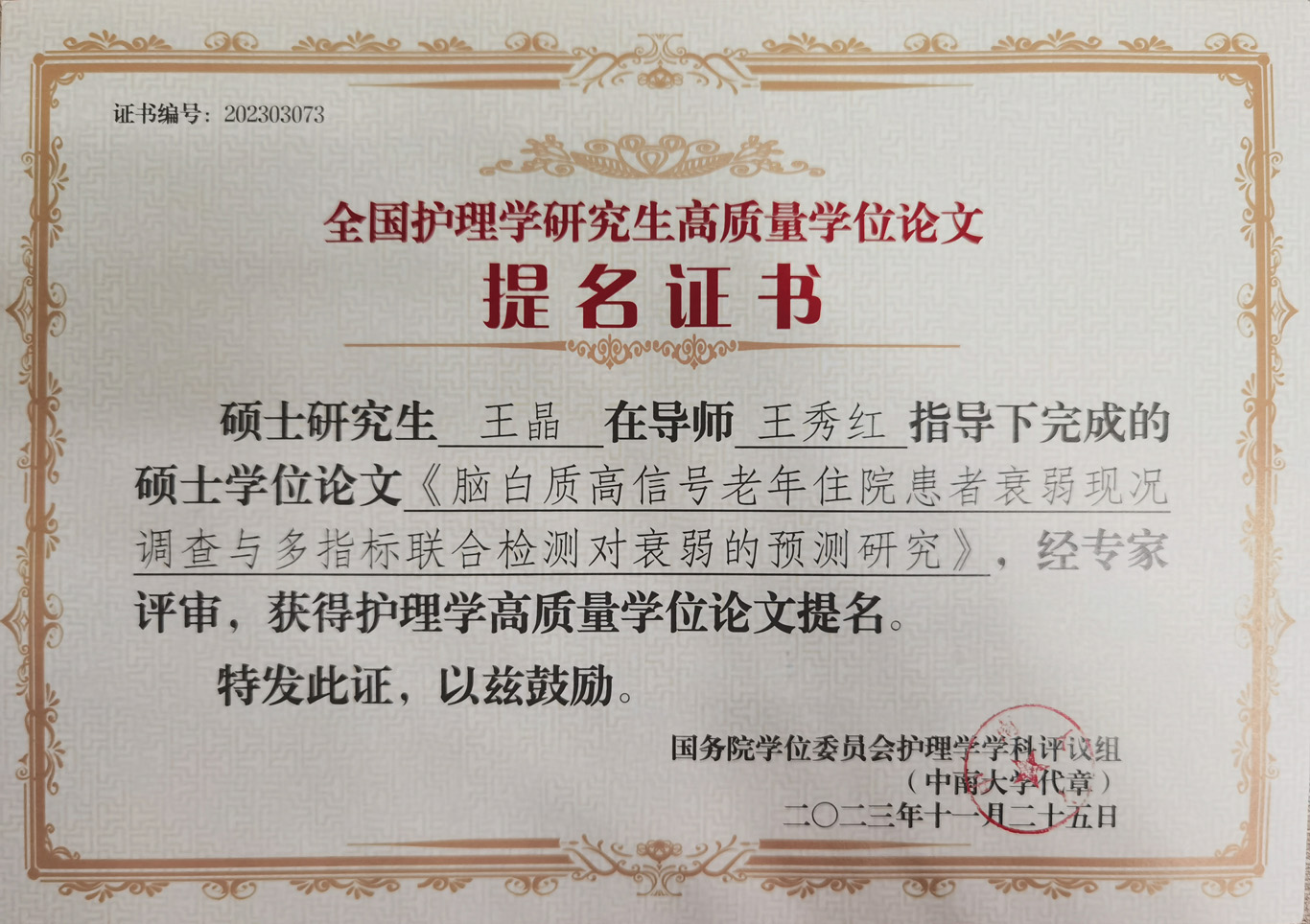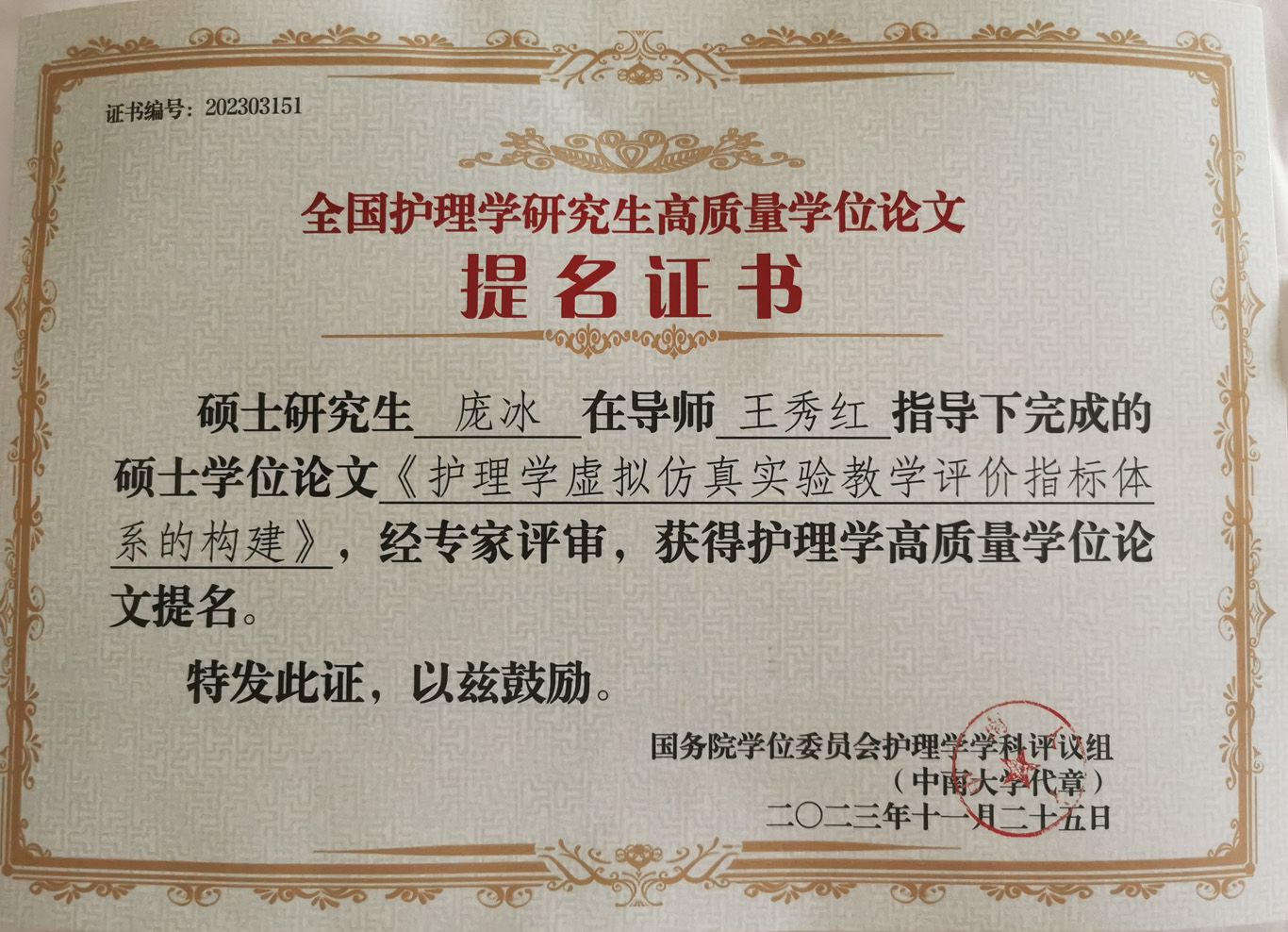会议公布了前期由教育部护理学学科评议组开展的“高质量学位论文评选工作”情况及结果。来自全国70余所院校、2020届到2023届232篇博士硕士优秀论文进入评选目录。由研究生导师王秀红指导的BEAT365英国官网2021届护理学学硕研究生王晶、2023届护理学学硕研究生庞冰的学位论文获评高质量学位论文提名奖。