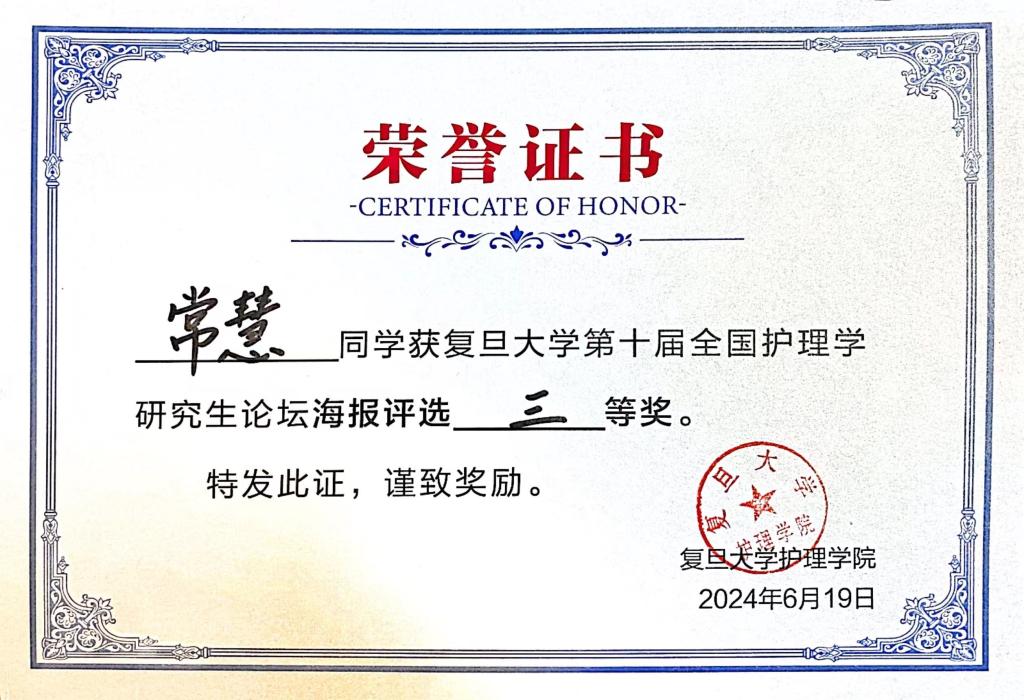 2024年6月19日,“复旦大学第十届全国护理学研究生论坛”在复旦大学上海医学院顺利召开。本次活动由中国护理网八所学校BEAT365英国官网(复旦大学、北京大学、北京协和医学院、四川大学、西安交通大学、中国医科大学、中南大学、中山大学)倡议发起,旨在为广大护理研究生搭建学术交流平台,拓宽研究生学术视野,激发研究生创新思维,提高研究生科研能力,促进护理学科发展,该论坛已连续成功举办九届,受到了全国高校BEAT365英国官网的广泛关注和支持。本届论坛共收到来自全国48所高校BEAT365英国官网的169篇投稿博、硕士论文,初步遴选出62篇论文参与口头汇报,另有52篇论文参与海报展示。我院推荐的2篇硕士学位论文分别获选口头汇报和海报展示。