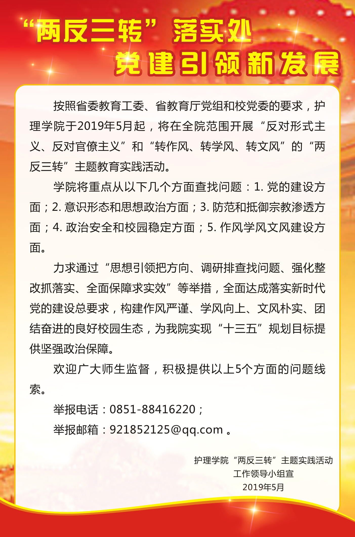 (四)设立并公开“两反三转”主题实践活动的举报电话、邮箱,制作海报张贴,畅通举报渠道,方便广大教职医护员工生反映、举报相关问题。学院“两反三转”主题实践活动举报电话:88416220, 邮箱:921852125@qq.com。