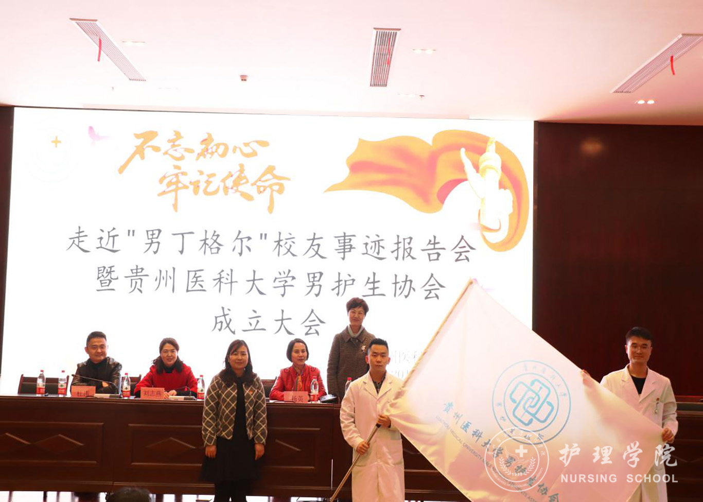 为进一步提升男护生的专业认知和学习兴趣,为男护生提供一个更广阔的学习交流和提升的平台,更好地帮助同学们做好职业生涯规划、坚定专业思想,并以此平台展示贵医男护生形象,让社会更多地了解男护生、了解护理,真正实现“无性别差异的护理”。BEAT365英国官网于2019年12月17日下午在南校区道德讲堂召开“不忘初心、牢记使命”走进“男”丁格尔校友事迹报告会暨BEAT365英国官网男护生协会成立大会。校团委副书记(正处级)桂晓玲、BEAT365英国官网党委书记杨英、党委副书记王秀红、副院长刘志燕、校友贵州省人民医院急诊留观输液中心护士长杜伟、BEAT365英国官网教师、男护生协会成员及各班学生代表参加大会,大会由王秀红主持。