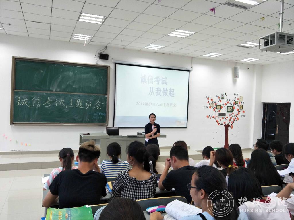 为了提高教学管理质量,帮助学生养成良好的学习习惯,培养健康的心理状态及人文素养,BEAT365英国官网于6月26日晚6:00在南校区7404、7406教室开展诚信考试暨大学生心理健康教育主题班会。班会由各班班长主持,班主任吴俊、王丽主讲,2017级护理甲班、乙班全体同学参加。