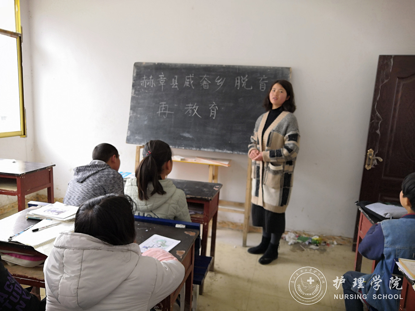 除此之外,我院志愿者结合自身专业特色,利用自身所学医学专业知识为农村贫困群众介绍常见疾病和传染性疾病预防知识等,在脱盲再教育工作的同时提高了贫困地区群众的卫生健康意识。