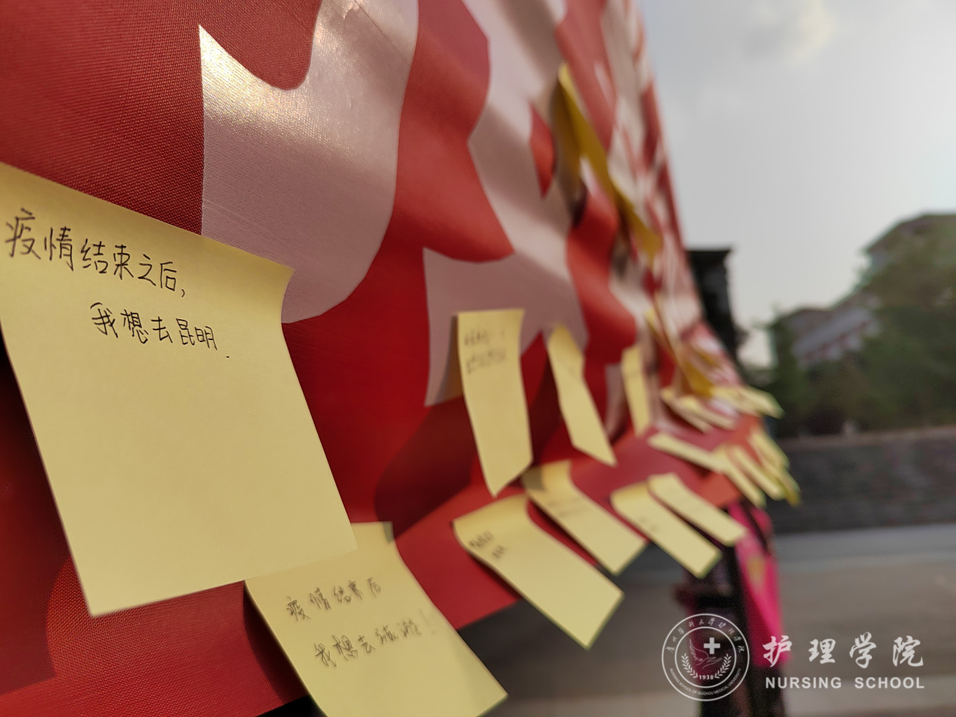活动举办前夕,易班分站全体成员召开了工作安排部署会,拟定了活动方案,并对分工做了详细部署。活动当天,各部门成员按时到场,各司其职,积极引导同学们通过便利贴的形式贴上自己的祝福语,并现场开展投壶小游戏。期间,同学们纷纷写上自己的祝福,“疫情结束后,我想大吃一顿、我想给想见的人一个拥抱、我想……”短短时间内,横幅上贴满了同学们的祝福和期待,便利贴虽小,却充满了无限感动。活动最后,易班分站指导老师兰光倩到场为同学们加油鼓劲,希望同学们心怀感恩,共同抗疫,朝着目标,向着希望前进,勇担时代之责、绽放青春之花。