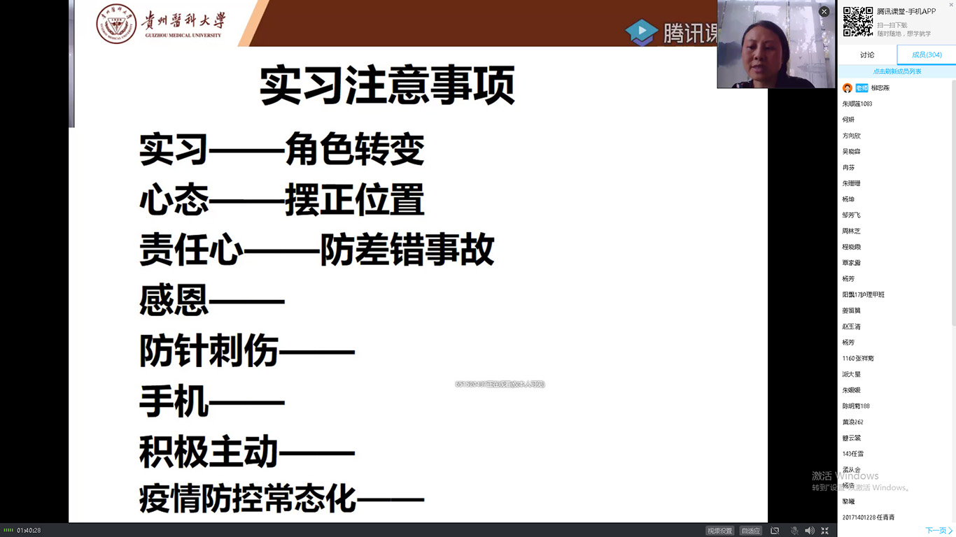 首先,由柳忠燕通过腾讯课堂平台为2017级本科同学和专升本同学主讲《课题设计》直播课和实习指导。柳忠燕就《课题设计》做详细介绍,并以选题、文献调研和科研设计三个方面着重进行讲授,以生动形象的案例来引导同学们构建科研思维,在临床工作中如何用科研思维看待问题并解决问题。柳忠燕鼓励同学们在临床实习中,要认真对待,积极发现,勇于提出科研问题。柳忠燕对同学们到各实习点医院的报到内容、注意事项进行了详细指导并对同学们的实习疑问进行了解答,希望同学们在实习中能够端正思想和心态,增强责任感,保护好自己,积极主动地完成实习。