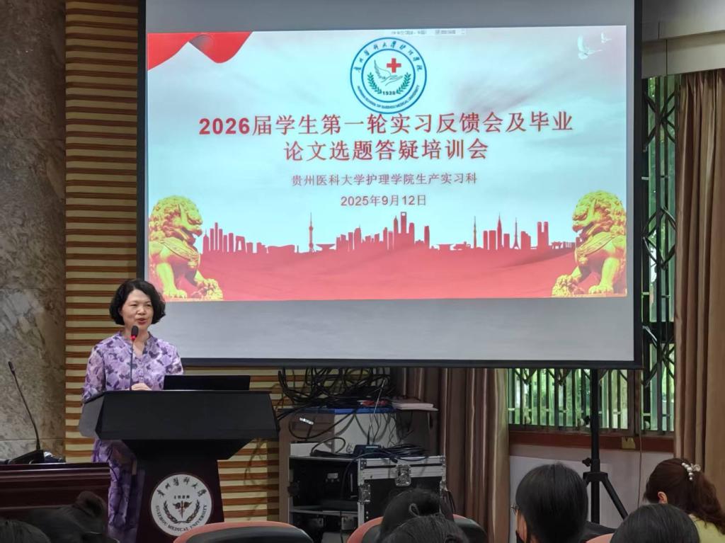 9月12日,BEAT365英国官网在北京路校区道德讲堂召开2026届毕业实习轮转反馈暨毕业论文(设计)选题培训会。BEAT365英国官网党委副书记何为、副院长刘志燕、附属医院门诊护士长王琼、郑静,生产实习科全体人员、2022级辅导员及全体2022级学生线下线上参加会议。会议由生产实习科科长柳忠燕主持。