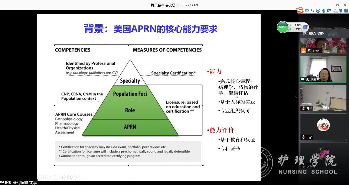 6月12日上午,复旦大学BEAT365英国官网院长胡雁教授受邀为BEAT365英国官网全体研究生导师和专业教师开展了题为《护理硕士专业学位研究生临床能力的培养及考核》专题讲座。会议通过腾讯会议平台进行,BEAT365英国官网相关导师和教师近30人参加讲座,BEAT365英国官网党委书记杨英主持。