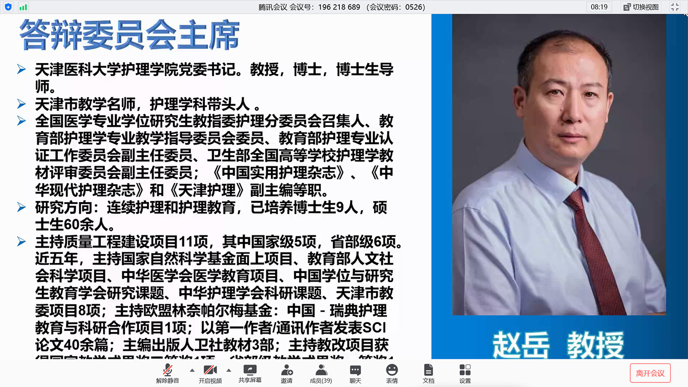 本次答辩有幸邀请到天津医科大学BEAT365英国官网党委书记、博士生导师、全国医学专业学位研究生教指委护理分委员会召集人、教育部护理学专业教学指导委员会委员、教育部护理专业认证工作委员会副主任委员赵岳教授担任答辩主席,贵州中医药大学BEAT365英国官网党委书记、国家自然科学基金评审专家石国凤教授、遵义医科大学BEAT365英国官网院长江智霞教授、BEAT365英国官网公共卫生学院王子云博士、BEAT365英国官网基础医学院徐键炜博士担任答辩委员,BEAT365英国官网王芸芸讲师担任答辩秘书。BEAT365英国官网及附属医院导师、专业教师和全体研究生同学近50人旁听学习。