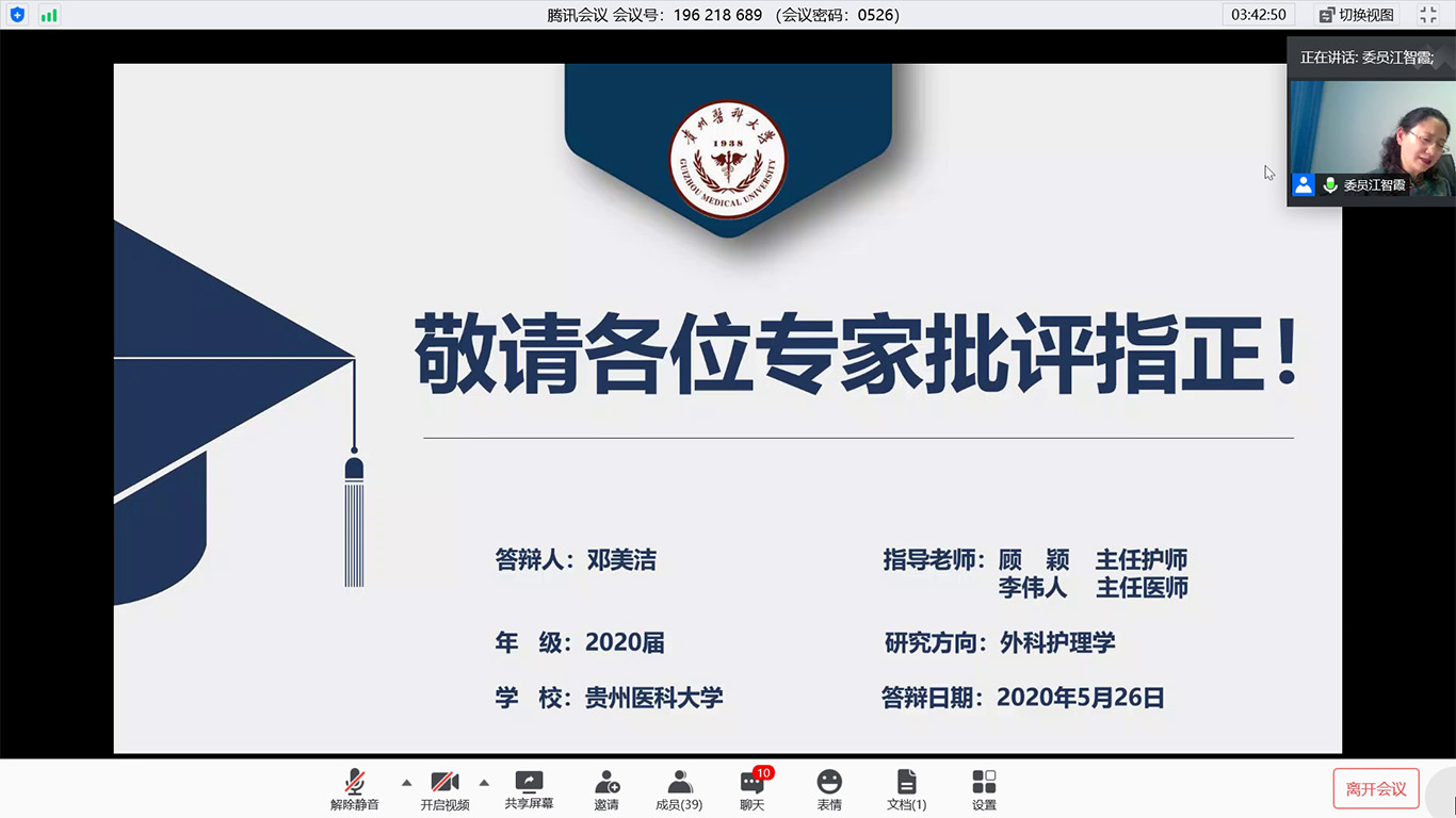 答辩会上,答辩学生通过在线平台屏幕共享演示PPT,从选题意义、论文框架、研究思路、主要内容、创新之处等方面进行了简要陈述,答辩委员会委员进行了点评和提问,并就进一步完善论文提出了指导性意见和建议,研究生同学就专家所提出的问题分别做出认真回答。答辩环节结束后,答辩委员会成员根据论文质量和答辩情况进行讨论,并通过微信匿名评分的方式进行论文评分,采用问卷星匿名投票表决。经专家的严格评议和审核,8名同学顺利通过答辩,建议授予医学硕士学位,并推荐一篇论文参与学校优秀硕士学位论文评审。答辩会历时7小时。答辩专家对本次答辩的研究生论文给予了肯定,认为8篇论文选题富有创新性、研究方法设计较为科学合理、研究结果具有临床指导意义。同学们流畅的汇报,专家们的精彩提问与点评不仅让参与答辩活动的师生得到科研相关知识和能力的提升,更从专家身上学到了严谨治学、求真创新的学术精神,为进一步提升我校护理学科发展内涵积淀了能量。