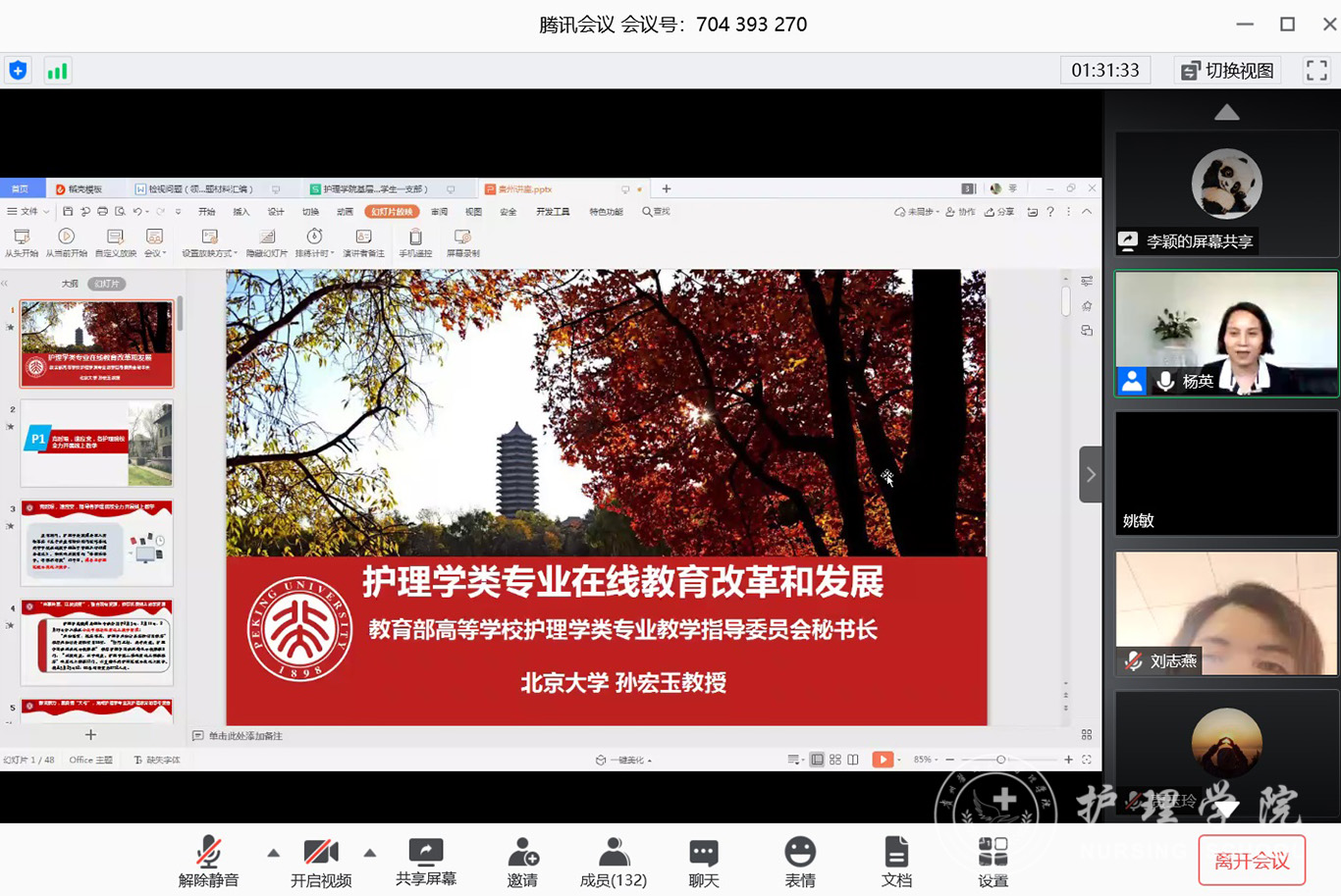 为提高在线教学质量,推动学院科研发展。5月19日,BEAT365英国官网特邀教育部高等学校护理学类专业教学指导委员会秘书长、北京大学BEAT365英国官网孙宏玉教授,以《护理学类专业在线教育改革和发展》为题,在腾讯会议平台为学院全体教职工、研究生、我校相关附属及教学医院护理同仁共计140余人做了一场精彩的报告。BEAT365英国官网党委书记杨英任主持。