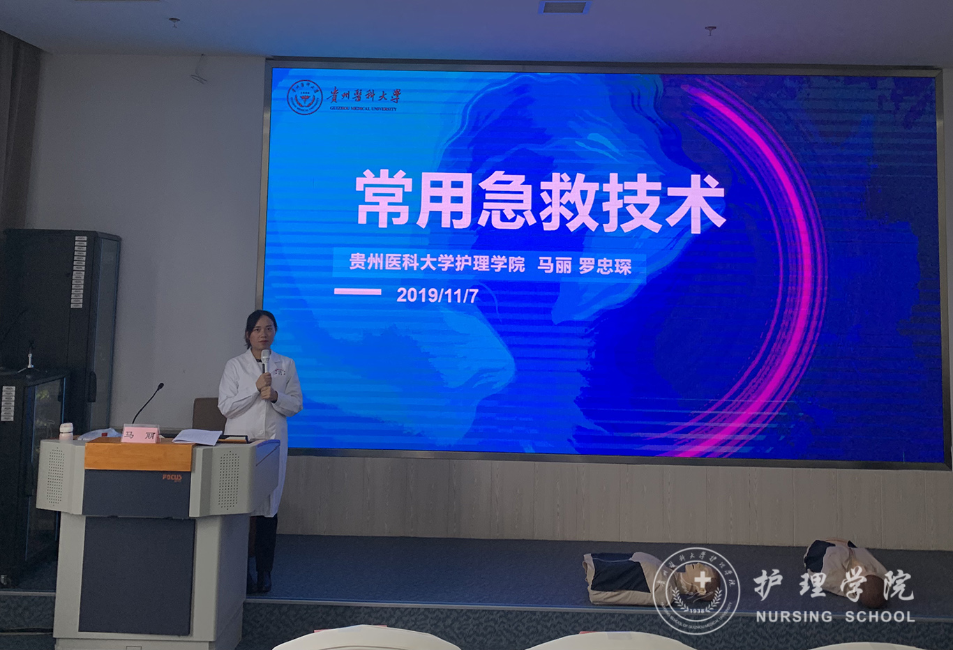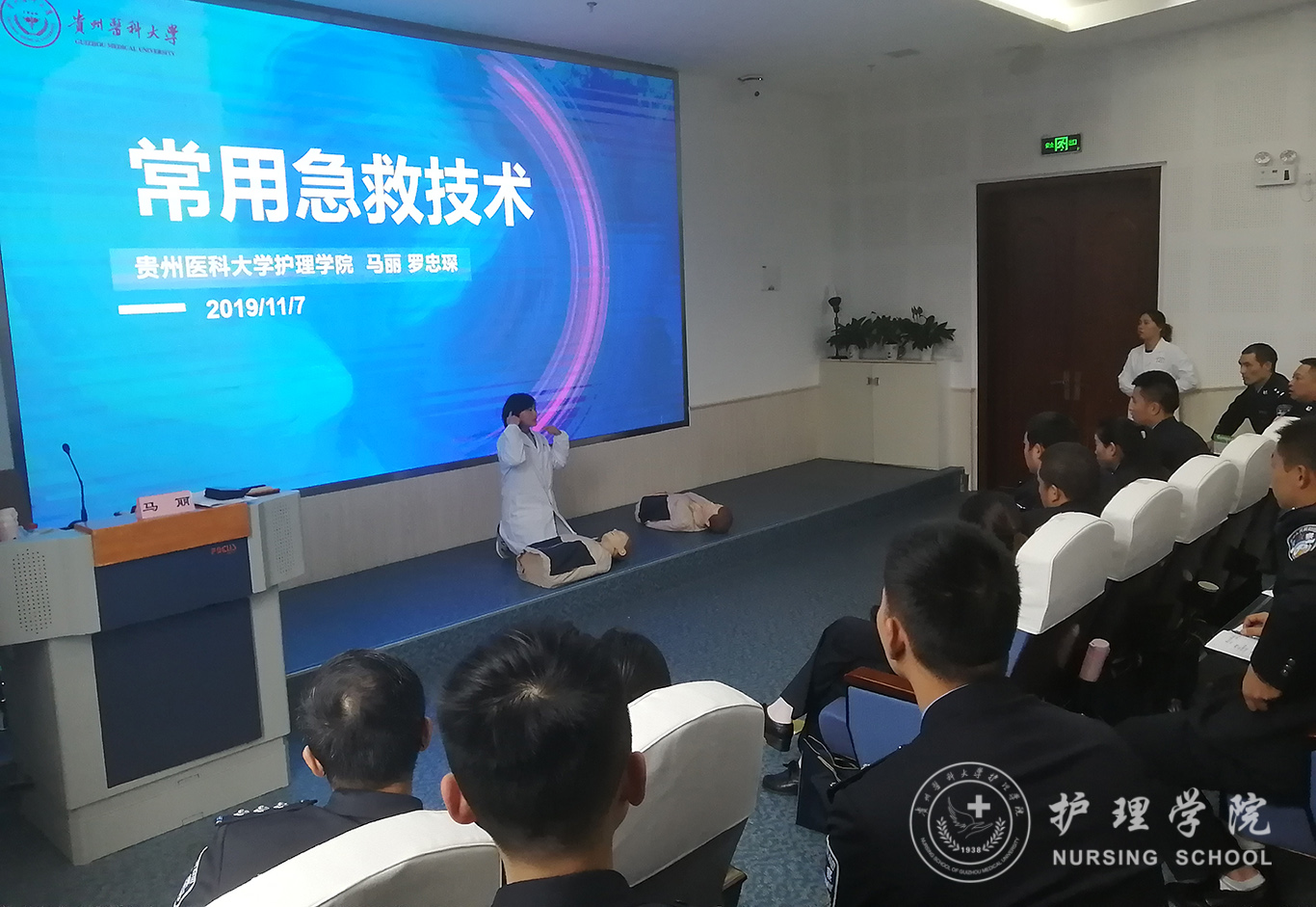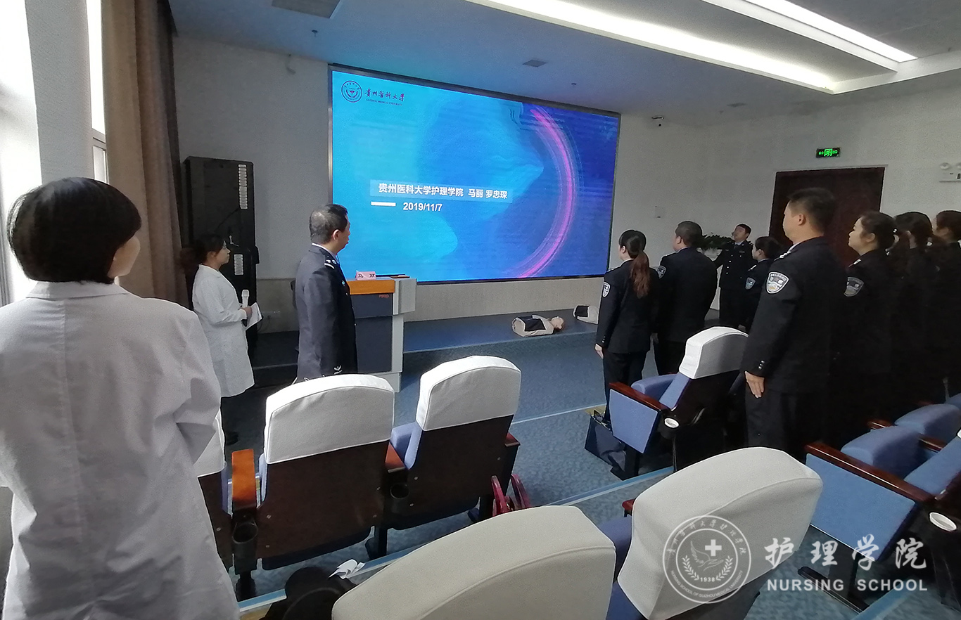受贵州省人民检察院法警总队邀请,中国南丁格尔志愿护理服务队BEAT365英国官网分队志愿者、BEAT365英国官网外科护理学教研室教师马丽和罗忠琛于11月7日到观山湖区国家检察官学院贵州分院为“2019年贵州省检察机关新入警及晋升警衔司法警察培训班暨支队长硏讨班”授课,培训学员共55人,培训内容为常用急救技术。