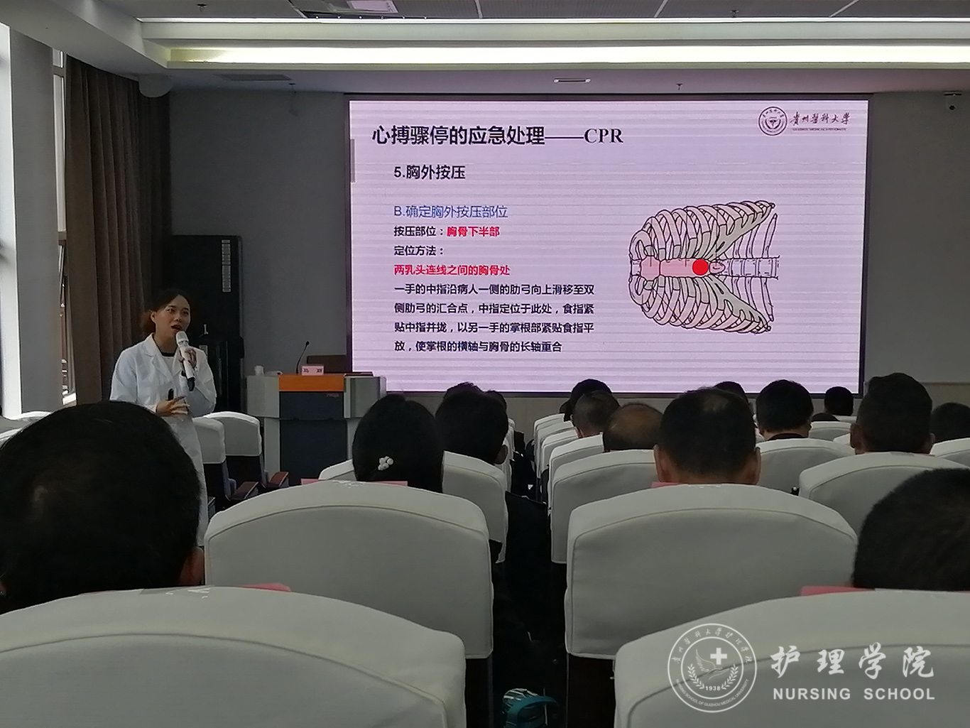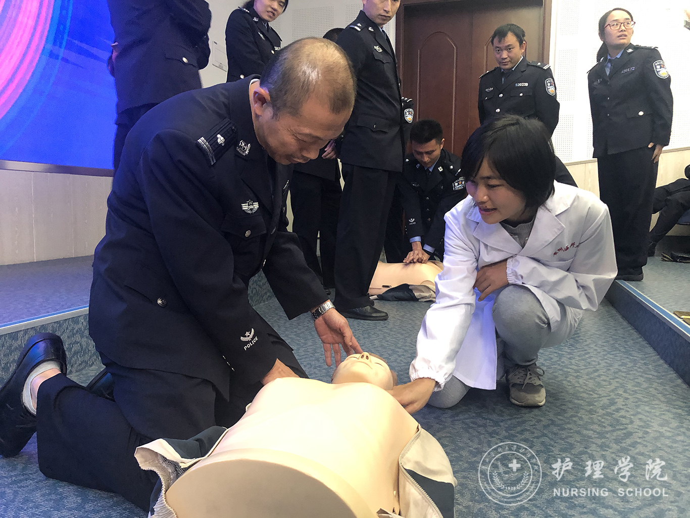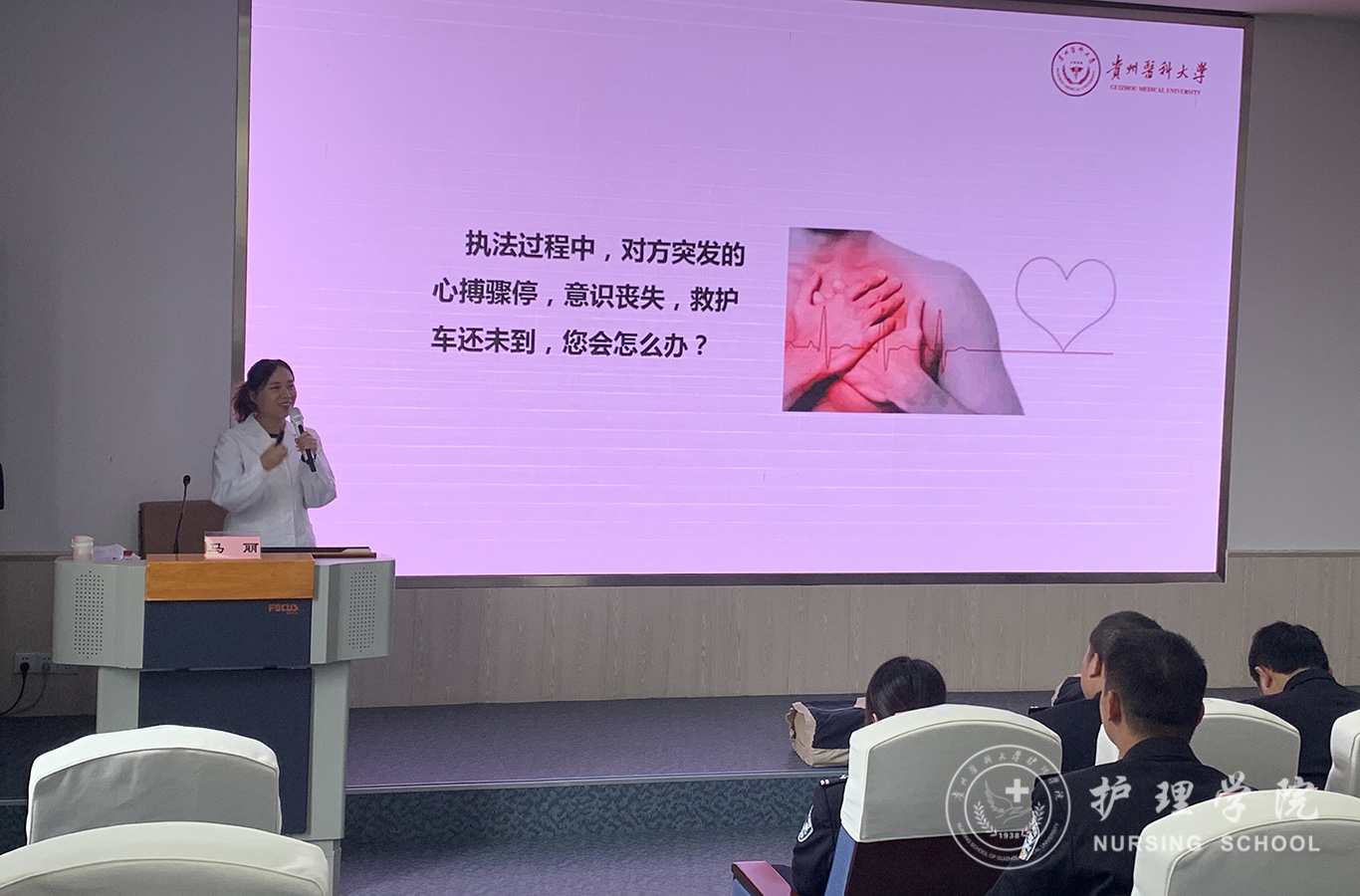 受贵州省人民检察院法警总队邀请,中国南丁格尔志愿护理服务队BEAT365英国官网分队志愿者、BEAT365英国官网外科护理学教研室教师马丽和罗忠琛于11月7日到观山湖区国家检察官学院贵州分院为“2019年贵州省检察机关新入警及晋升警衔司法警察培训班暨支队长硏讨班”授课,培训学员共55人,培训内容为常用急救技术。
