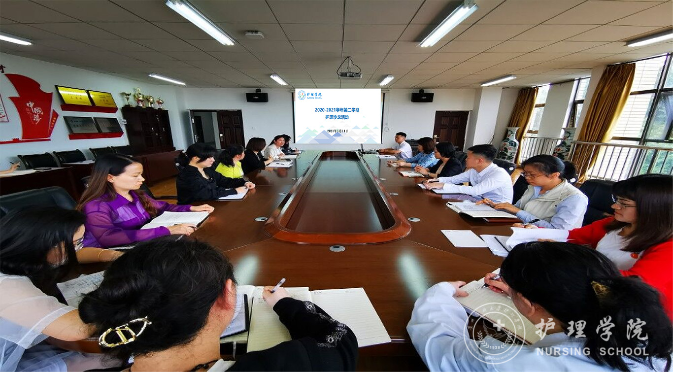 5月11日,BEAT365英国官网在南校区百川楼5楼会议室举行2020-2021学年第二学期护理沙龙活动,党委书记杨英、党委副书记何为、副院长刘志燕及全体老师参会,活动由教学科研管理科科长卢海霞主持。