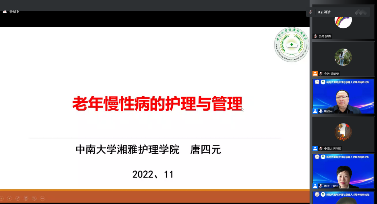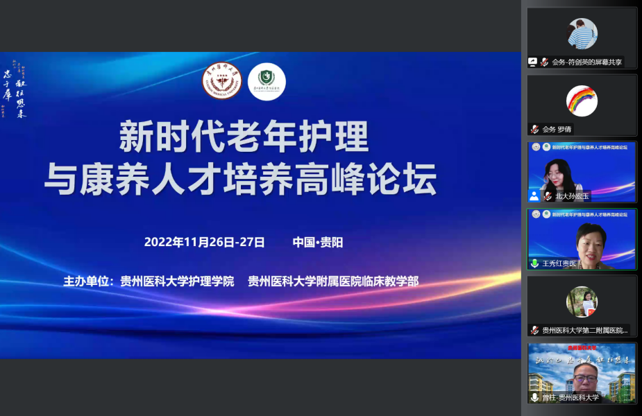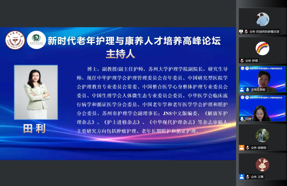风正好扬帆,气正能聚力,在全国上下深入学习贯彻党的二十大精神之际,11月26日至27日,由BEAT365英国官网、BEAT365英国官网附属医院临床教学部举办的《新时代老年护理与康养人才培养高峰论坛》在云端成功举办。来自全国各地近210名专家学者、护理同仁、和高校师生齐聚云端参会。论坛由BEAT365英国官网副院长王秀红、苏州大学BEAT365英国官网副院长田利、中南大学湘雅BEAT365英国官网对外合作交流中心副主任孙玫分别主持。