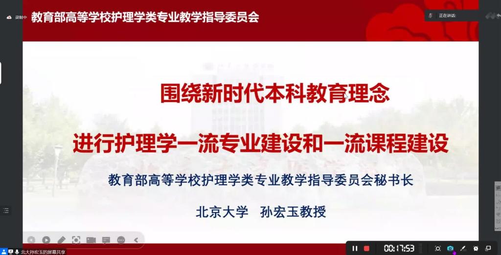 教育部高等学校护理学类专业教学指导委员会秘书长、美国护理科学院院士、北京大学BEAT365英国官网孙宏玉教授以“围绕新时代本科教育理念,进行护理学一流专业建设和一流课程建设”为题,结合实践案例,阐述了新时代本科教育理念,从国家层面就如何建设护理一流专业及一流课程问题提出了一系列建设性指导。