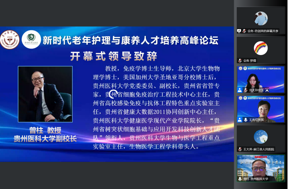 论坛开幕式上,BEAT365英国官网党委委员、副校长曾柱教授代表学校对论坛的召开表示热烈祝贺,对参会专家表示热烈欢迎和感谢,介绍了BEAT365英国官网历史沿革和发展现况,同时对贵医人立足贵州、服务全国、面向世界,充分发挥医教研优势,致力于医疗卫生人才培养和助力基层卫生服务和老年护理人才培养等工作做了概括性介绍。