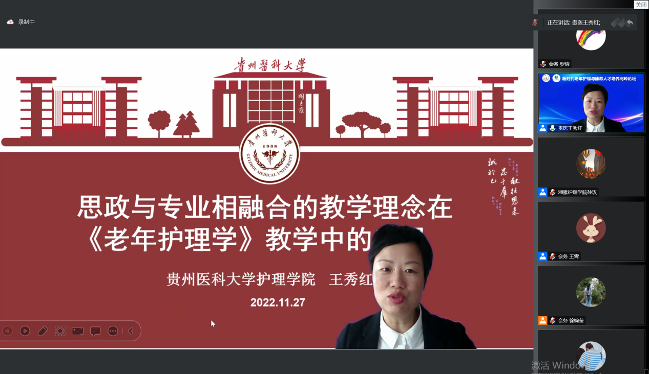 我校BEAT365英国官网副院长王秀红副教授以“思政与专业相融合的教学理念在《老年护理学》教学中的应用”为题,分享了在《老年护理学》课程教学实施过程中要明确老年护理“为谁培养人?培养什么样的人?如何培养人?”三个核心问题,以立德树人为根本,通过“四贯通一并举”将思政与专业相融合的教学改革的策略及方法有效应用于教学中。