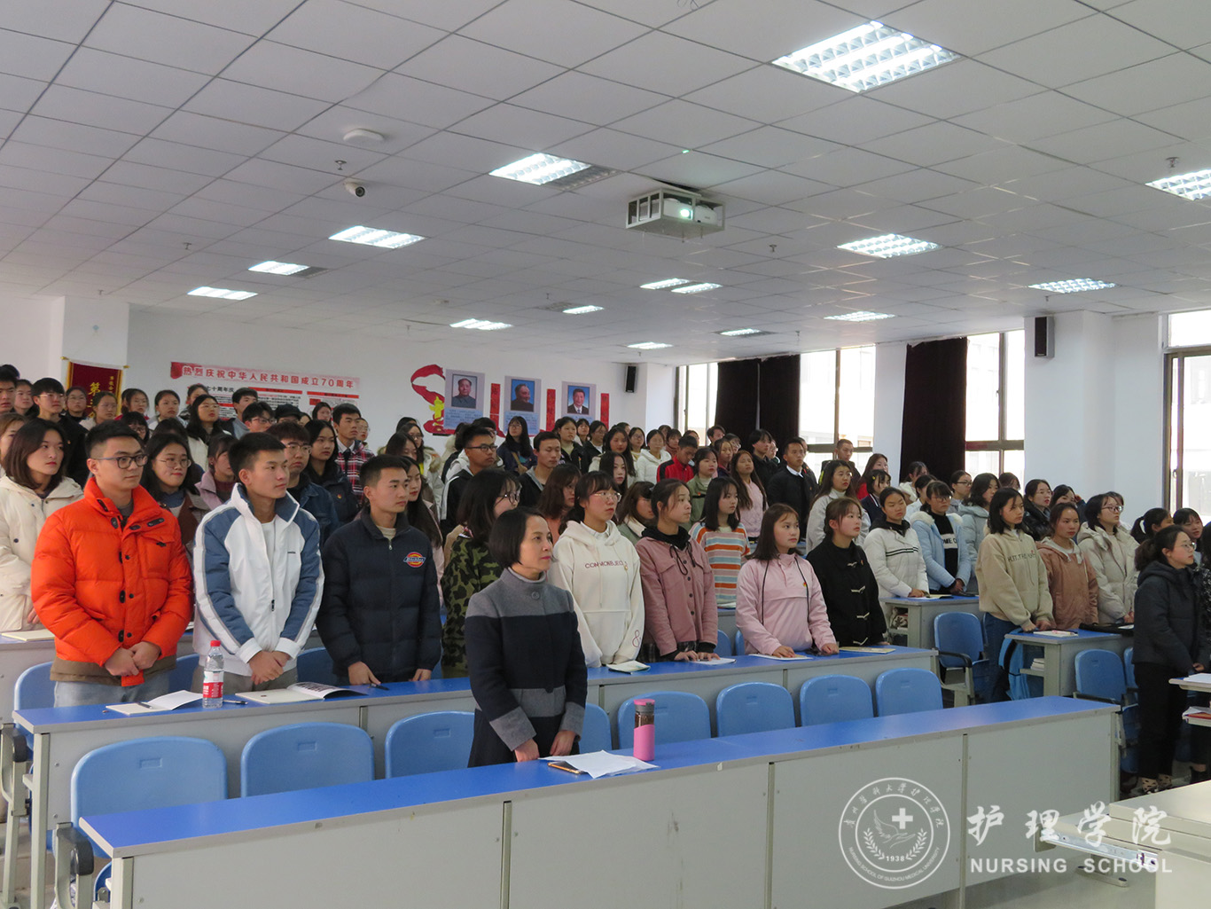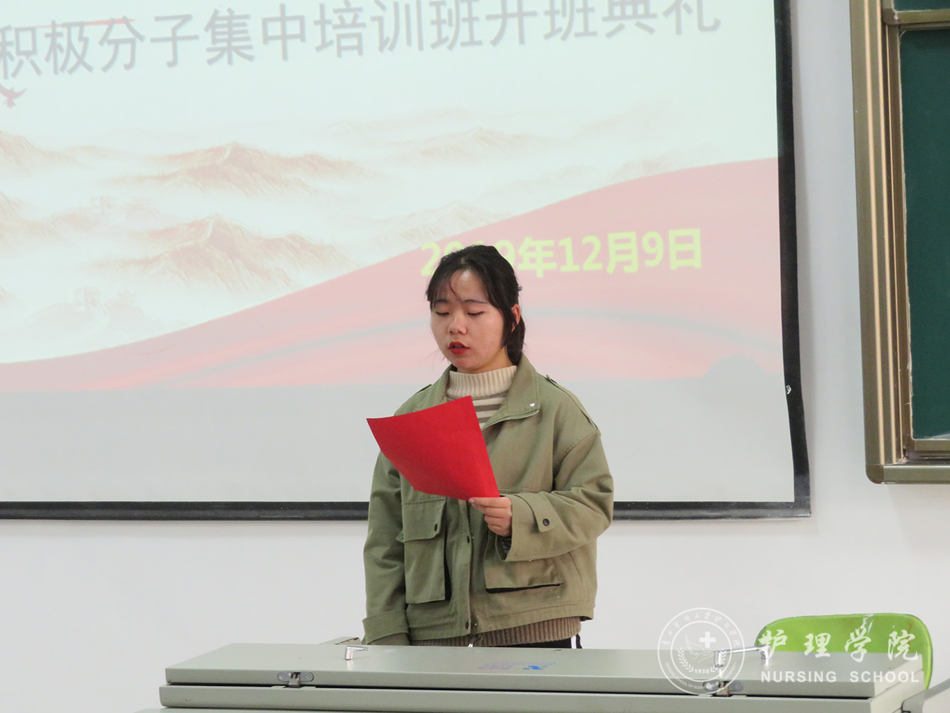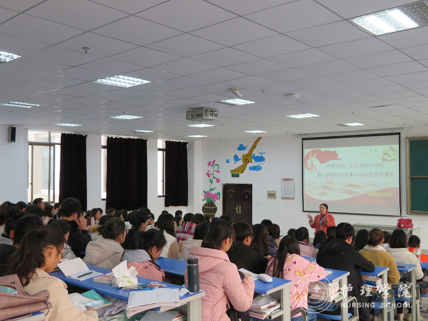 随着庄严神圣的国歌声响起,全体起立,开班典礼正式拉开帷幕。2019级护理丙班代晶晶作为学员代表发言,她表示会积极参加各项培训活动,严格遵守纪律,在党校认真学习党的理论和党的相关知识,积极向党组织靠拢。杨英作动员讲话她要求全体学员在上党课期间要做到不迟到,不早退,认真学习贯彻党的十九大精神。杨英强调遵守纪律的重要性,作为入党积极分子应努力学习党的方针政策,加强党的理论知识的学习,发扬严于律己、吃苦耐劳的精神,并提出了三点要求:一是希望同学们志存高远,坚定永远跟党走。二是希望同学们认真学习,提升素养。三是端正入党动机,树立正确三观,牢记中国共产党的初心和使命,为共产主义事业奋斗终身的殷切希望。曾敏做会议总结,指出此次党校集中培训有利于同学们明确入党目的,端正入党动机,增强“四个意识”,坚定“四个自信”,做到“两个维护”,坚决从思想上先入党。她希望通过此次党课的学习同学们可以成为讲政治、有信念、讲规矩、有纪律、讲道德、有品行、讲奉献、有作为的共产主义事业可靠的接班人,为光荣加入党组织奠定坚实基础。本次培训班持续两周,由专题课,分组讨论,社会实践观看专题教育片,集中讨论等环节组成。