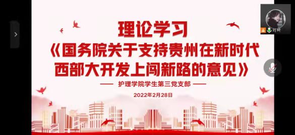 2月28日至3月7日,BEAT365英国官网三个学生党支部在腾讯会议开展了关于《国务院关于支持贵州在新时代西部大开发上闯新路的意见》(以下简称《意见》)的学习及研讨。学生第一党支部书记杨叶卿、学生第二党支部书记刘文壮、学生第三党支部书记刘妍分别主持会议,各支部党员参会。