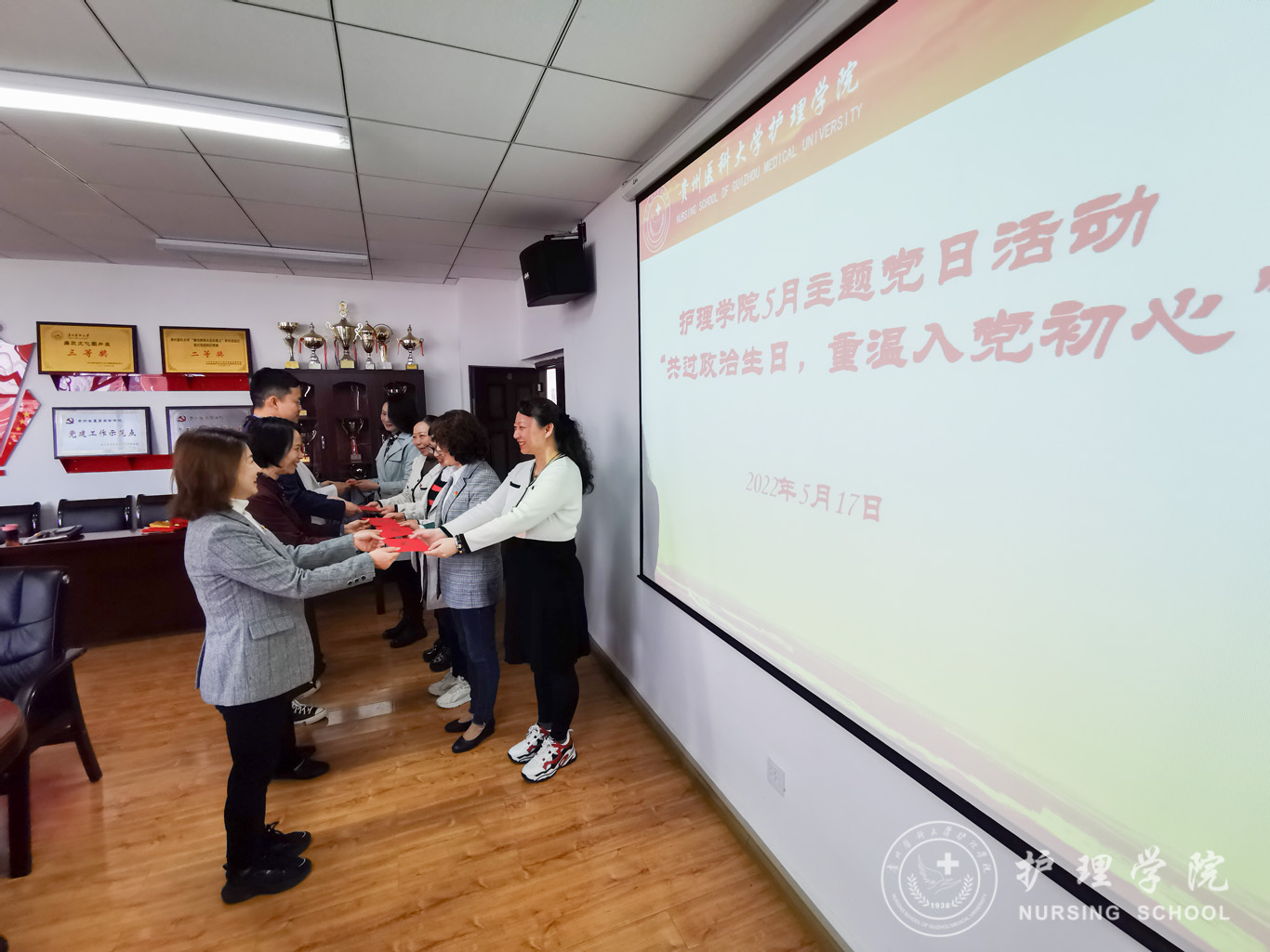 首先进行的是“共过政治生日,重温入党初心”主题党日活动。活动中,副院长刘志燕等5名党员分享了她们的入党初心,党委书记杨英、党委副书记兼纪委书记何为、副处级组织员张黎及支部书记张仁莉为5名党员送上了精心准备的贺卡,参会党员一起重温了入党誓词。