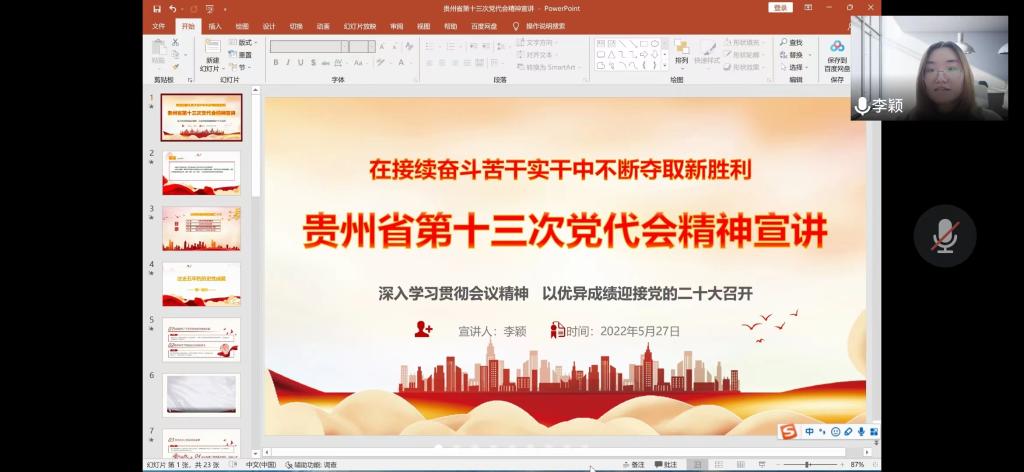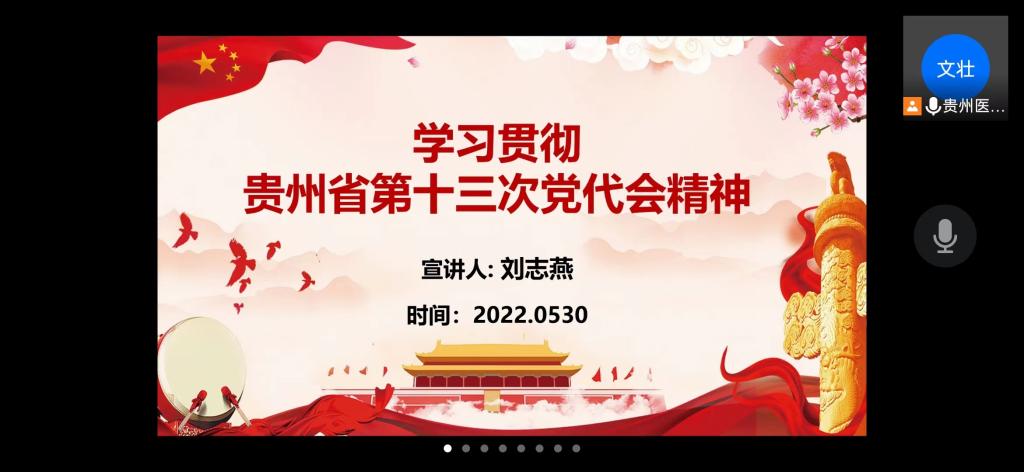 为深入学习贯彻省第十三次党代会精神,激励广大党员奋力谱写多彩贵州现代化建设新篇章,学院党委委员、副院长刘志燕,党委委员、综合办公室副主任李颖分别于5月27日和30日在BEAT365英国官网学生第二党支部开展了省第十三次党代会精神宣讲活动。支部全体党员通过线上线下结合的形式参加宣讲,学院分党校第五十六期入党积极分子培训班学员列席宣讲。本次宣讲活动由支部书记刘文壮主持。