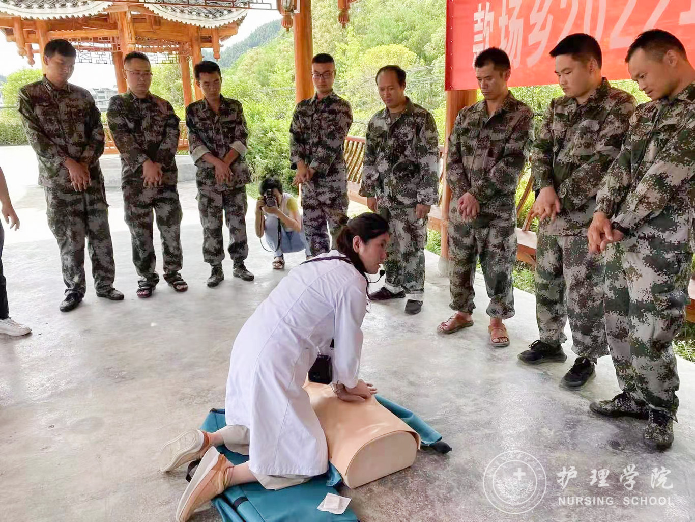 同时,为推进学院党建品牌建设工作,教职工党支部组织教师党员在款场乡开展了应急救护培训和义务测量血压血糖等志愿服务活动。志愿服务队针对当地的实际需求,以理论讲解、演示教学、实践操作等多种方式,为款场乡应急队伍讲解了“心肺复苏技术”“止血、包扎技术”等基本救护方法和技巧。部分队员为当地群众提供了测量血压血糖,疾病护理知识科普等服务。
