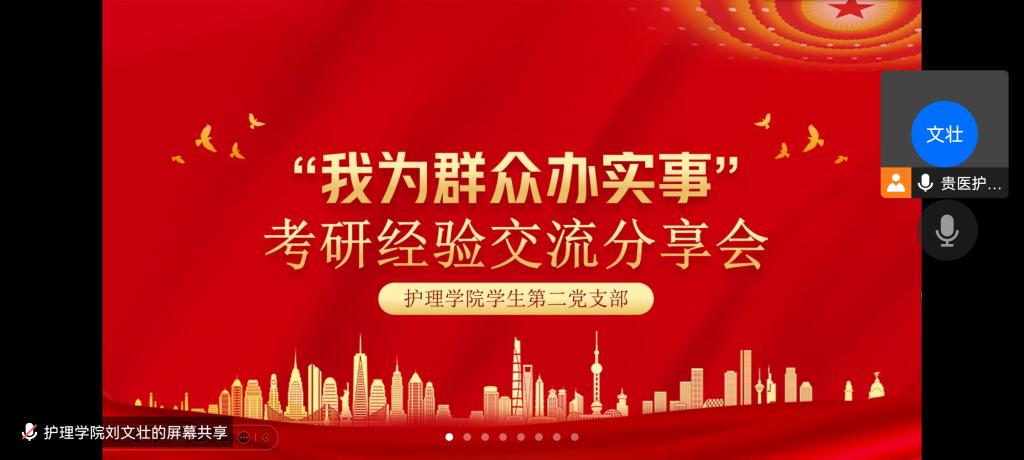 11月30日,为充分发挥优秀学生党员的先锋模范作用,用心用情为学生办实事解难题,BEAT365英国官网学生第二党支部在腾讯会议线上举办了“我为群众办实事”——考研经验交流分享会主题党日活动,研究生党员代表黄虹久面向支部党员及参会的BEAT365英国官网2019级本科生作了考研经验分享报告,会议由党支部书记刘文壮主持。