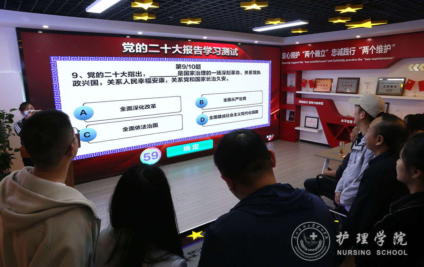 活动中,陈鹏宇和杨英分别介绍了各自党委、支部党建工作开展情况,随后在解说员的指引下,学院党员参观了天眼传媒有限责任公司的多功能智慧党建空间,通过参观该空间的线上红色展馆学习了延安精神,亲身体验了VR座椅上的红色之旅。在充分感受了智慧党建的强大功能后,全体参会人员共同学习了数字党课《深化党和国家机构改革合理配置——宏观管理部门职能》,还开展了党的二十大精神和党史知识趣味抢答。活动最后一项由学院师生党员代表卢海霞、马丽、黄虹久为对方党员开展了心肺复苏术和海姆立克急救术的培训。