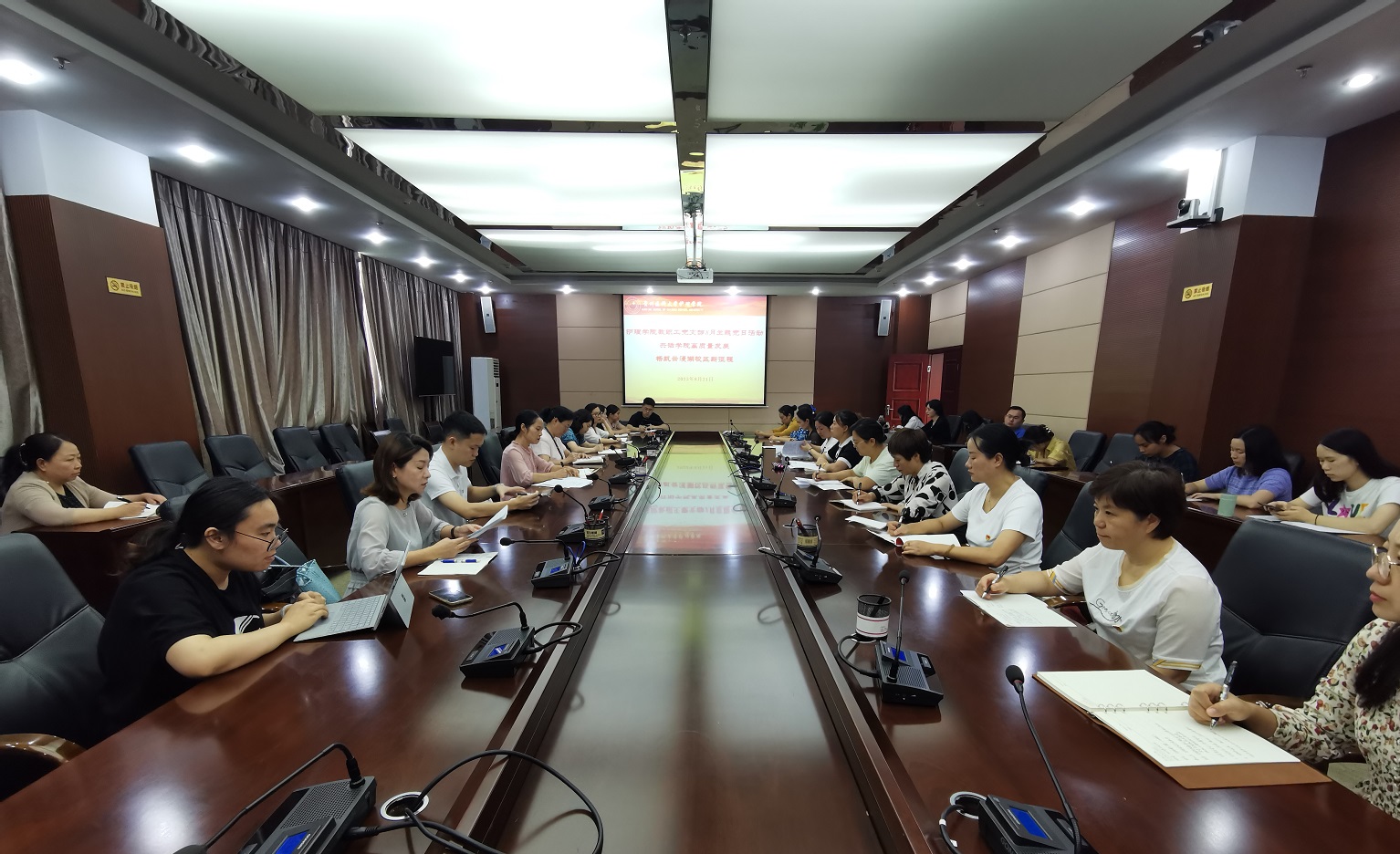 2023年8月21日上午,BEAT365英国官网教职工党支部在北京路校区行政楼六楼连廊会议室开展了“共话学院高质量发展 扬帆云漫湖校区新征程”主题党日活动。本次活动由教职工党支部书记张仁莉同志主持。