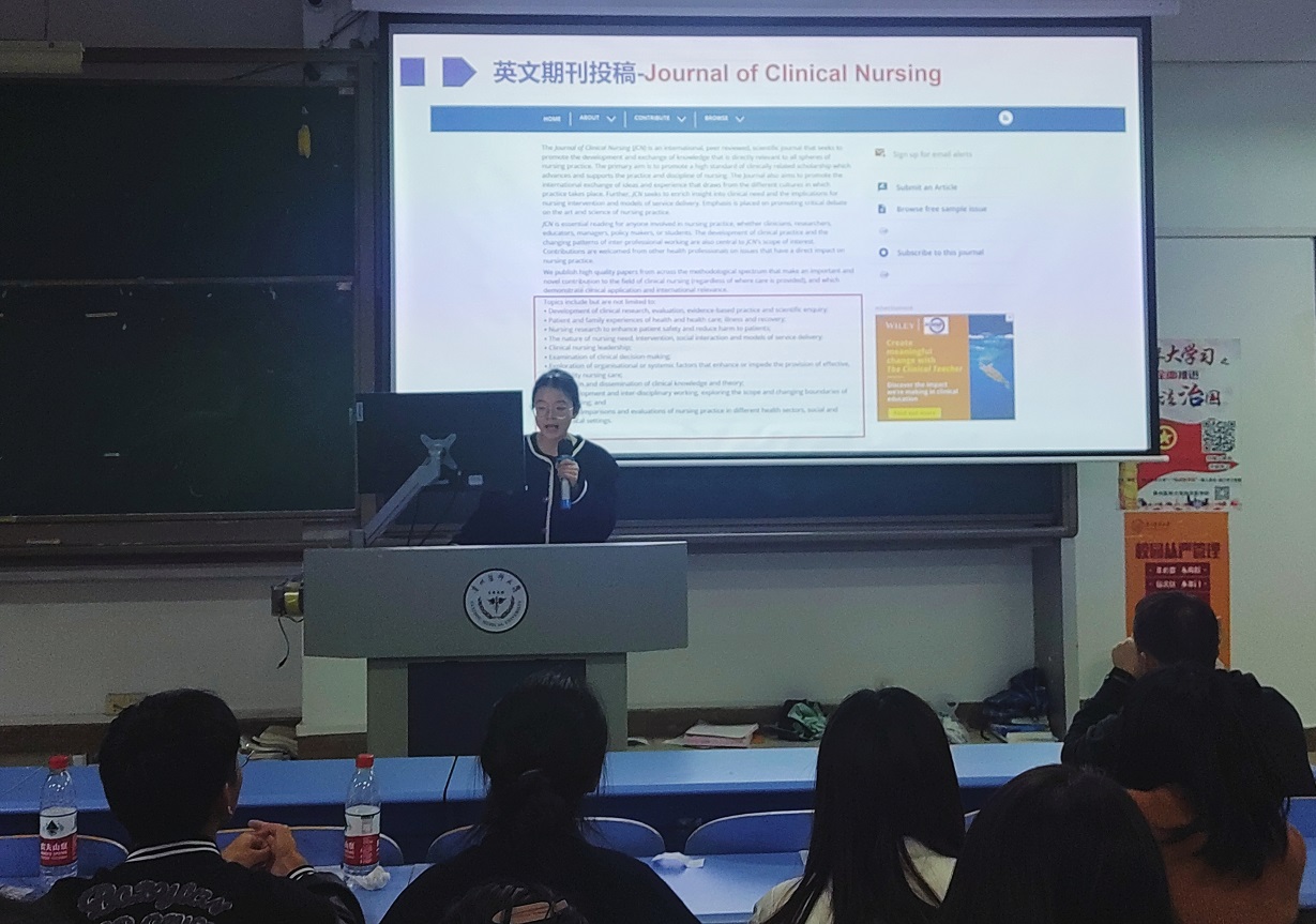 本次活动邀请了2021级研究生李蕾、常慧为大家分享学习、科研经验。她们着重从解读学院研究生培养方案、各学习阶段需掌握的学习内容、在临床轮转时具体要完成的任务、国内外护理期刊投稿的注意事项等几方面进行了详细的讲解,并鼓励大家积极参加社会实践活动,增长社会经验,丰富研究生生活。