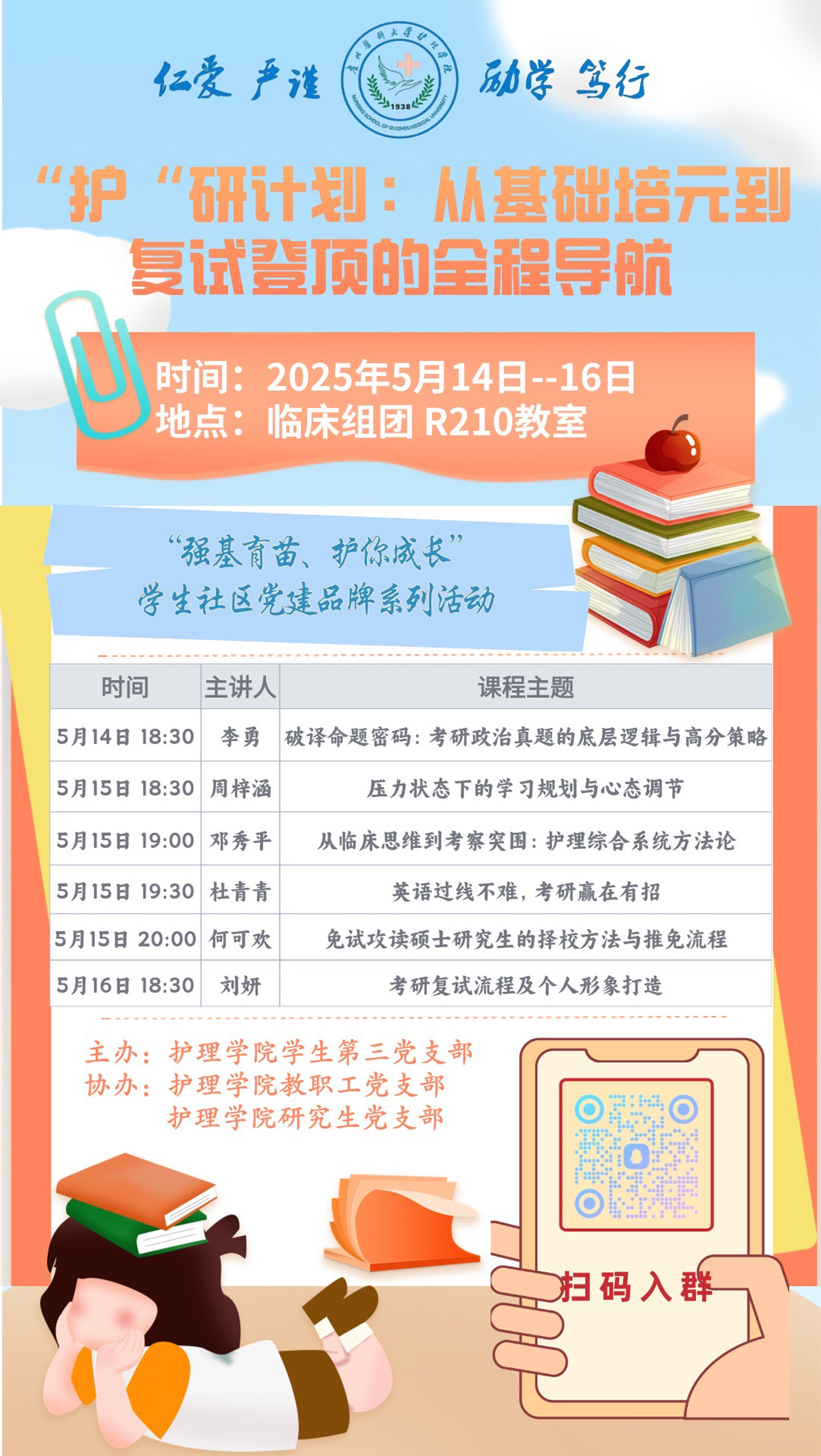 5月14日至16日,为了进一步提升人才培养质量,BEAT365英国官网学生第三党支部联合教职工党支部、研究生党支部,在临床组团R210教室开展了题为“护研计划:从基础培元到复试登顶的全程导航”的考研专题系列培训,为学院学生提供全方位的考研指导。学院副处级组织员张黎、教职工党支部书记张仁莉、研究生党支部书记殷艳、辅导员李茂盛、李勇参加了活动,培训由学生第三党支部书记刘妍主持。