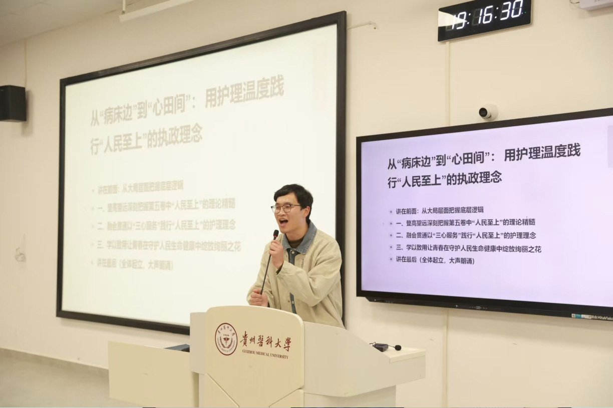 首场宣讲创新采用“师生合作、情景交融”模式,由李勇与护理学2024级1班学生马林飞、蒋福凤、杜思荣共同呈现。围绕“理论唠进心坎里”“实践练出真本事”“技能磨得精湛过硬”“青春建功新时代”四个篇章,通过案例解析、情景模拟等互动形式,将“人民至上”“高质量发展”等理论精髓与护理工作深度结合。内容涵盖“责任制整体护理”专业解读、临床一线“把小事当大事办”实践感悟及“专业技术硬杠杠、人文素养暖洋洋、职业认同亮堂堂”成长目标,让在场师生深刻体会到党的创新理论对护理工作的现实指导意义。