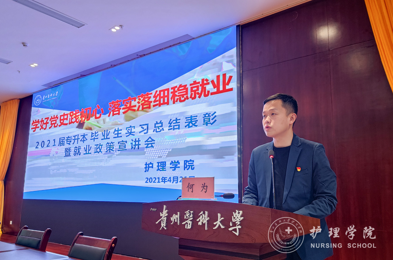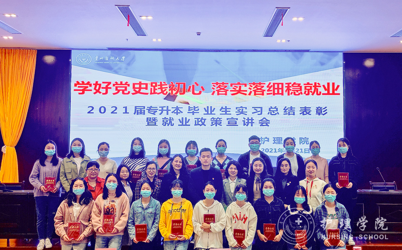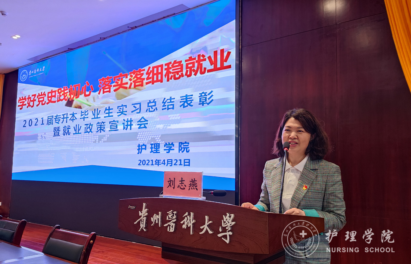 4月21日,为认真贯彻落实习近平总书记重要指示、批示精神,按照党中央、国务院决策部署,谋划和做好新发展阶段的就业工作,不断强化就业优先政策,努力实现更加充分更高质量就业,BEAT365英国官网在南校区道德讲堂开展“好党史践初心 落实落细稳就业”--2021届专升本毕业生实习总结表彰暨就业政策宣讲会。BEAT365英国官网党委副书记何为,党委委员、副院长刘志燕,正科级组织员曾敏,生产实习科科长柳忠燕,团委副书记王晓玲,学生党支部书记杨叶卿、李杏春、刘妍以及全体2021届专升本毕业生参会,会议由学生科副科长毕丽主持。
