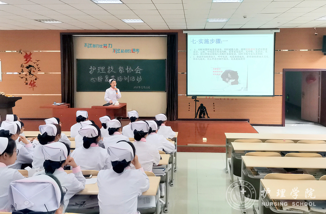 5月22日,为规范学生急救技能操作,提高应急抢救成功率,切实提高为人民群众办实事的能力,BEAT365英国官网护理技能协会于百川楼1101教室及模拟实验室组织开展了心肺脑复苏术培训,本次培训邀请到了在第十届中国大学生医学技术技能大赛中荣获团体二等奖的2017级护理丙班欧阳成晶与2017级护理乙班黄虹久进行指导,护理技能协会成员及各班代表参加培训。