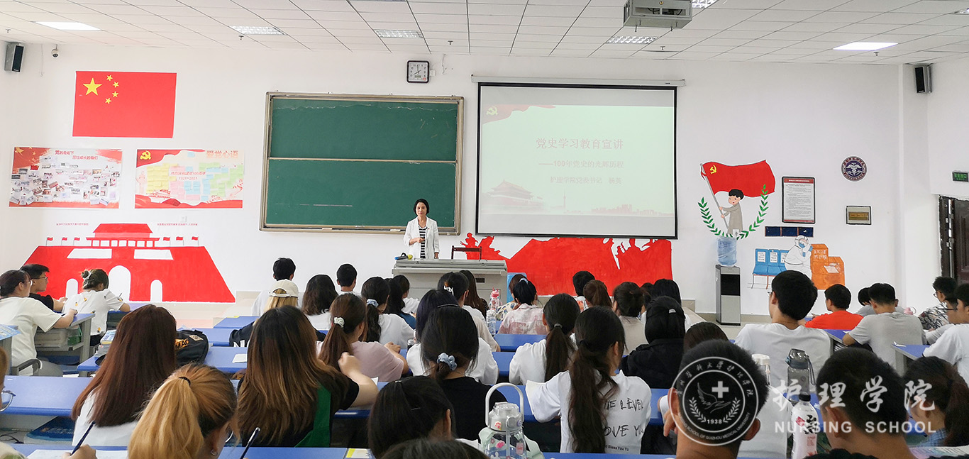 6月30日,为庆祝中国共产党建党100周年,深入学习中国共产党百年奋斗史,切实推进党史学习教育深入开展。BEAT365英国官网党委书记杨英在南校区广德楼X1504教室为BEAT365英国官网2019级护理学丙班开展党史学习教育宣讲,全体同学参加。