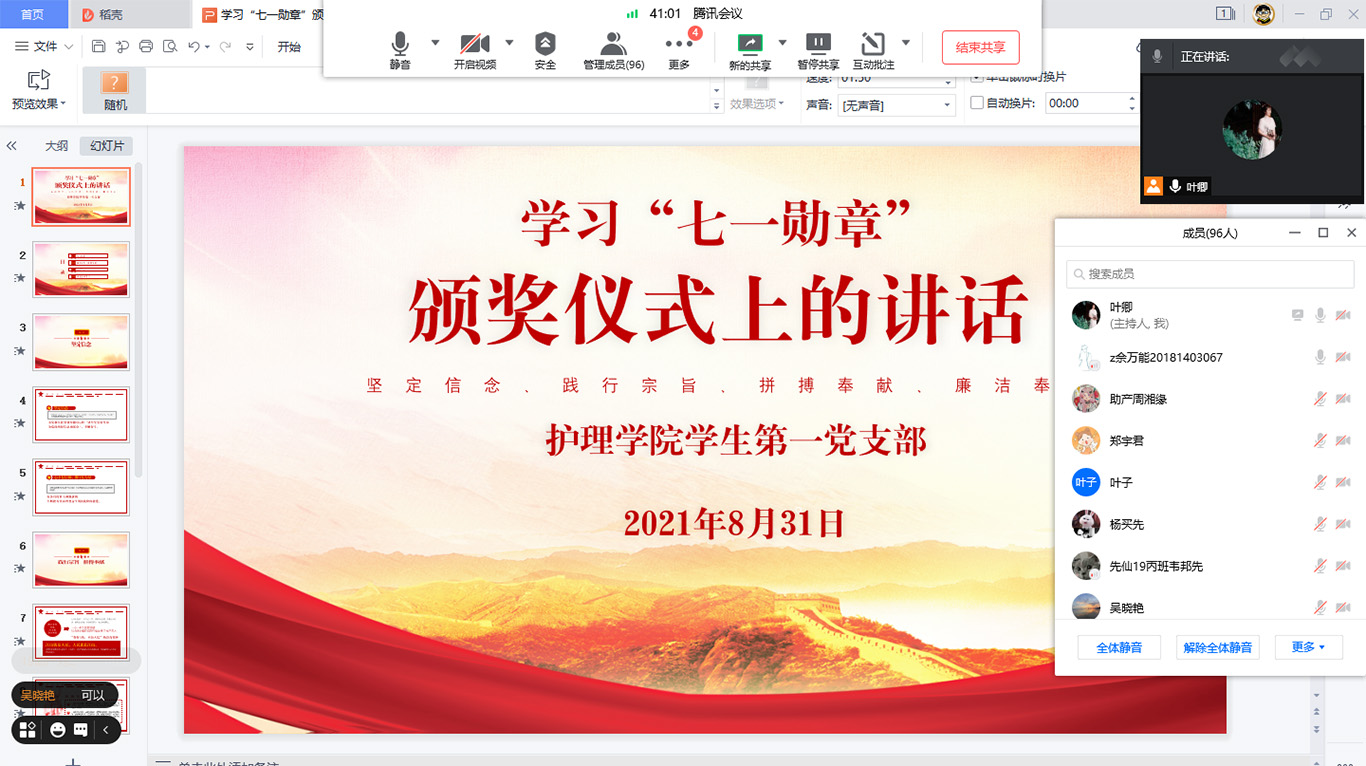 8月31日,为进一步弘扬功勋模范精神,引导广大学生党员学习先进典型“坚定信念、践行宗旨、拼搏奉献、廉洁奉公”的高尚品质和崇高精神。BEAT365英国官网学生第一党支部开展学习“七一勋章”颁奖仪式重要讲话精神。会议由BEAT365英国官网学生第一党支部书记杨叶卿主持,全体学生党员及入党积极分子通过线上形式参加会议。