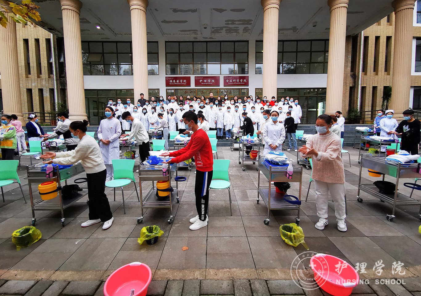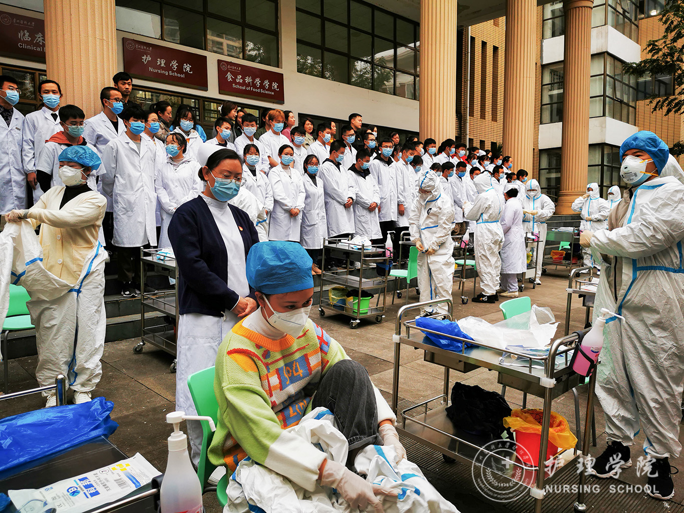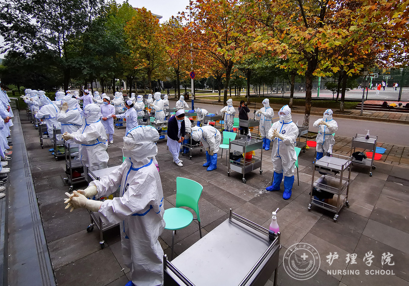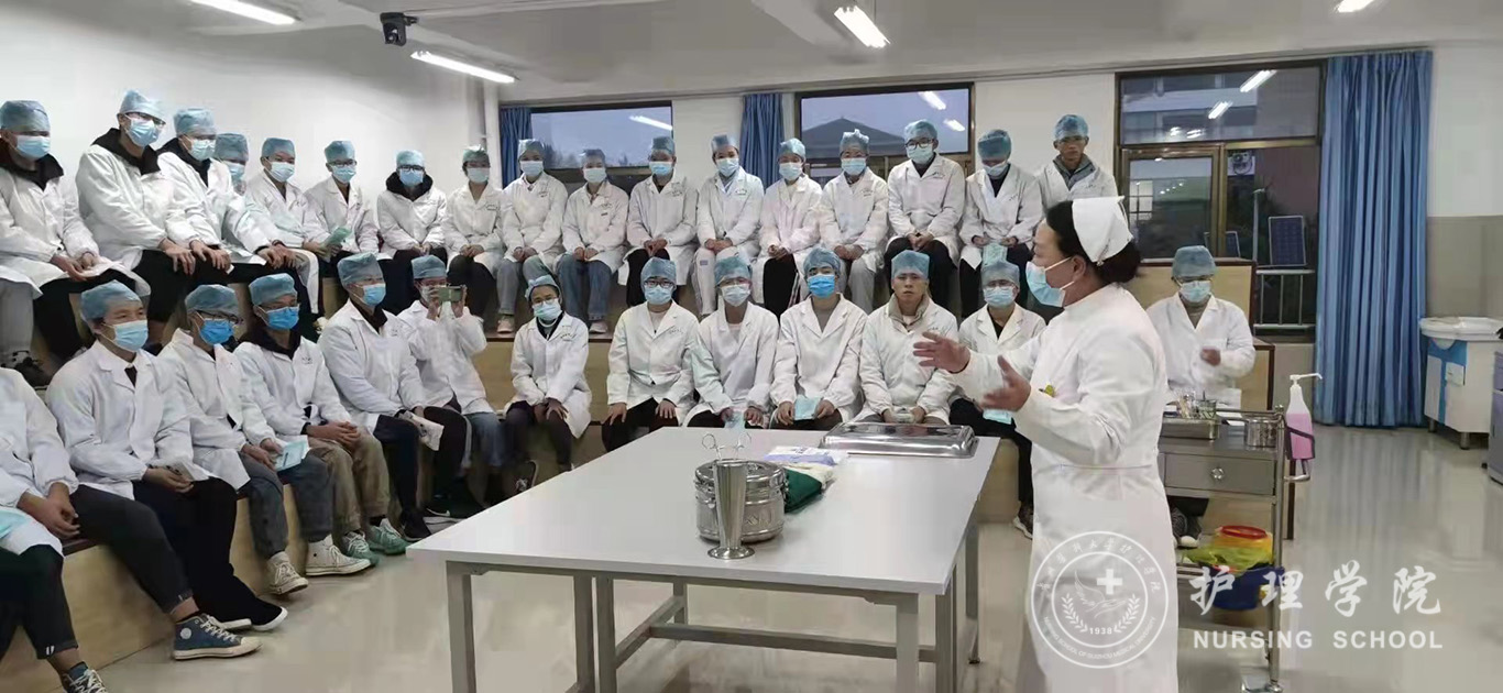 百川楼1楼小操场上,整齐摆放着30台治疗车,学生教练员早已准备就绪,随着老师一声令下,学生教练员开始现场演示如何正确穿脱防护服,他们个个认真、细心、严谨,展示了娴熟的操作技能。穿脱防护服演示结束后,我院基础护理学教研室的资深教师、学生最喜爱的肖霓老师,在百川楼三楼BEAT365英国官网示教室为协和班的同学进行了一场无菌操作示教活动,本次示教活动采取理论和实践相结合,生动形象的将无菌操作技术展现在同学们眼前,同学们均表示收获满满。最后,在获得防疫相关理论知识的基础上,BEAT365英国官网的30名学生教练员在模拟实验室开始对协和班的同学就如何正确穿脱防护服和采取咽拭子进行“一对一”指导和考核。