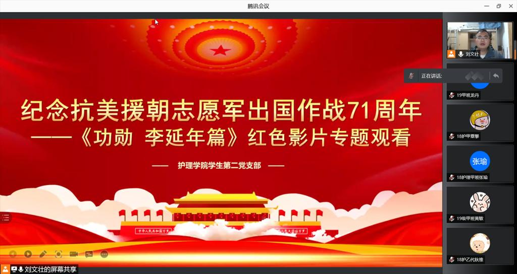 10月30日,为深入学习贯彻习近平总书记“七一”重要讲话精神,纪念抗美援朝志愿军出国作战71周年,BEAT365英国官网学生第二党支部在腾讯会议组织观看《功勋 李延年篇》专题红色影片。活动由BEAT365英国官网学生第二党支部书记刘文壮主持,BEAT365英国官网学生第二党支部全体党员参加。
