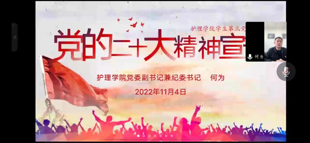 11月4日,为引导支部党员学习贯彻党的二十大精神的核心要义、精神实质和实践要求,BEAT365英国官网党委副书记兼纪委书记何为到学生第三党支部宣讲了党的二十大精神,会议由支部书记刘妍主持,支部全体党员参会。
