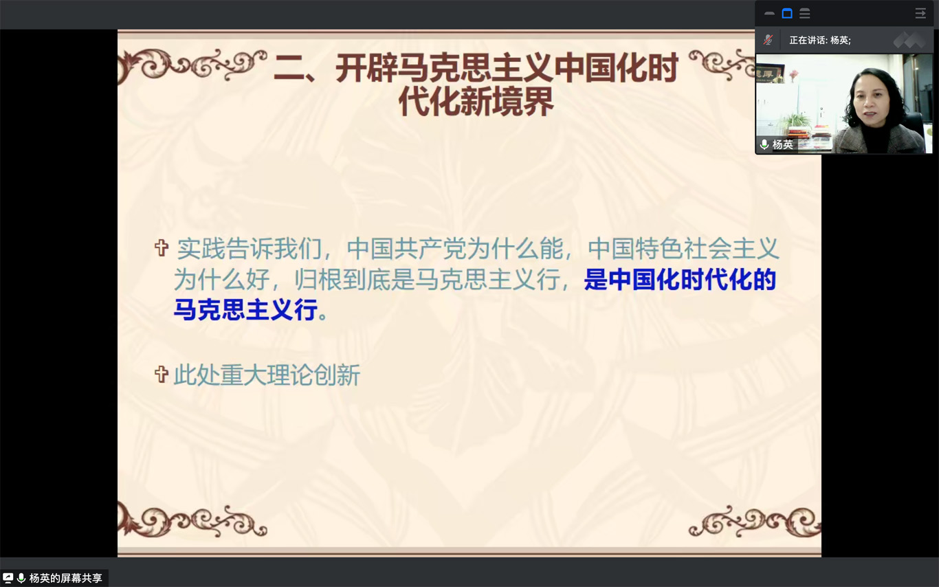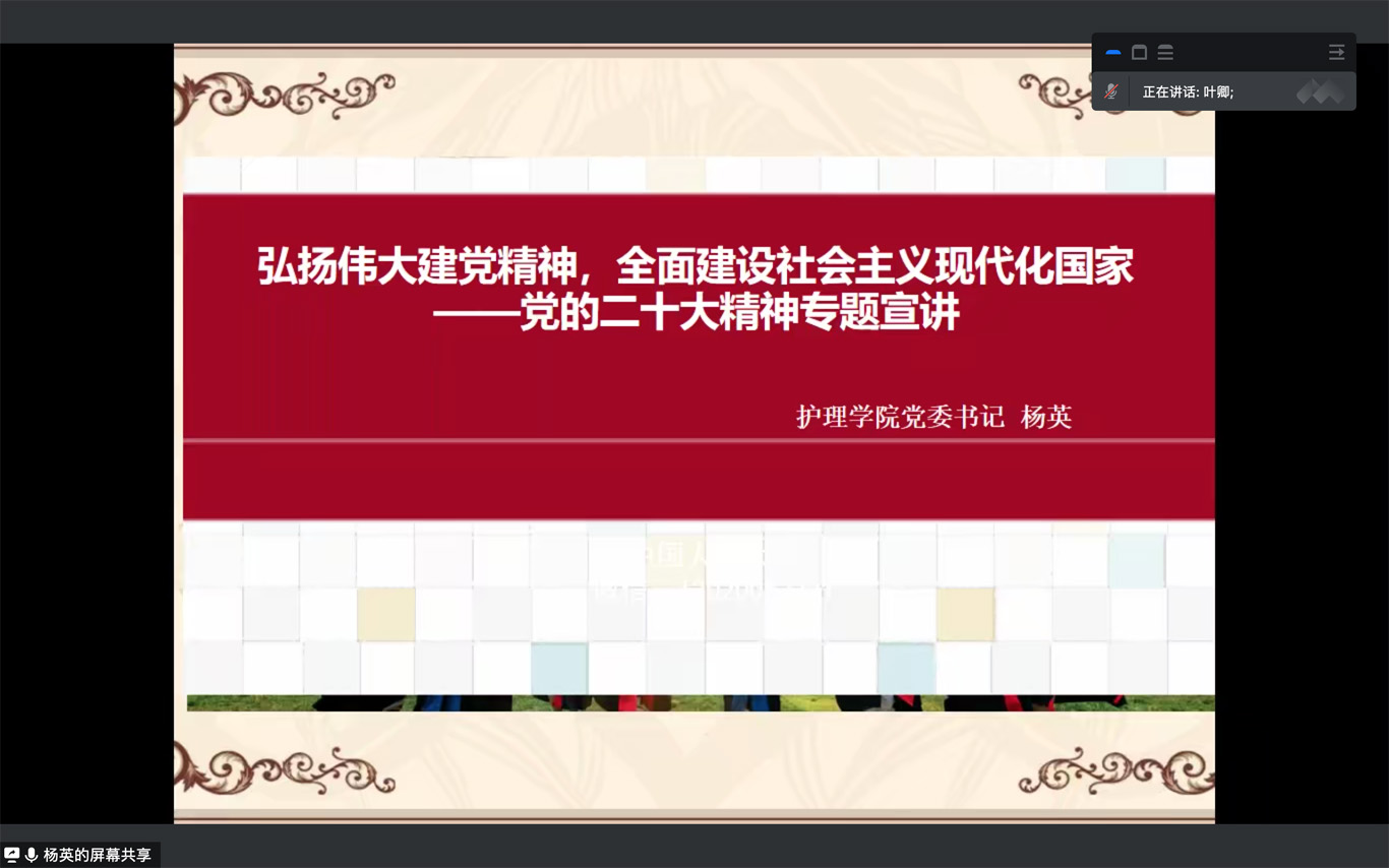 12月10日,为深入学习贯彻党的二十大精神,引导学生党员认真学习,领悟精神实质,BEAT365英国官网党委书记杨英以“弘扬伟大建党精神,全面建设社会主义现代化国家”为主题在BEAT365英国官网学生第一党支部宣讲党的二十大精神,会议由支部书记杨叶卿主持,全体支部党员、 入党积极分子通过腾讯会议参加本次宣讲。