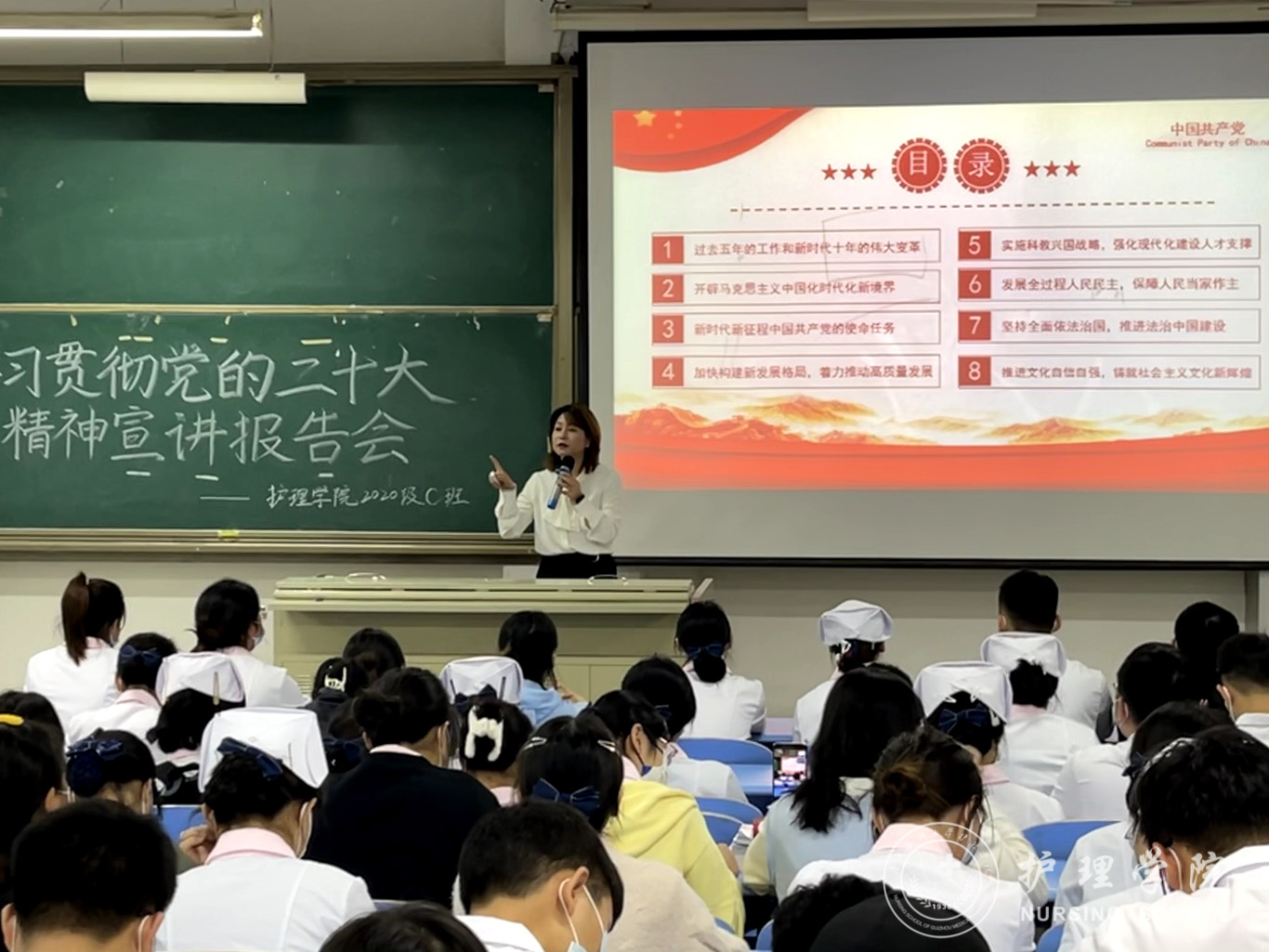 11月10日,为引导学生深刻领会把握党的二十大的重大意义、重大主题和重大成果,坚定不移衷心拥护“两个确立”、忠诚践行“两个维护”,BEAT365英国官网党委委员、副处级组织员张黎深入联系班级专题宣讲党的二十大精神,辅导员刘妍及护理学2020级C班全体学生参会。