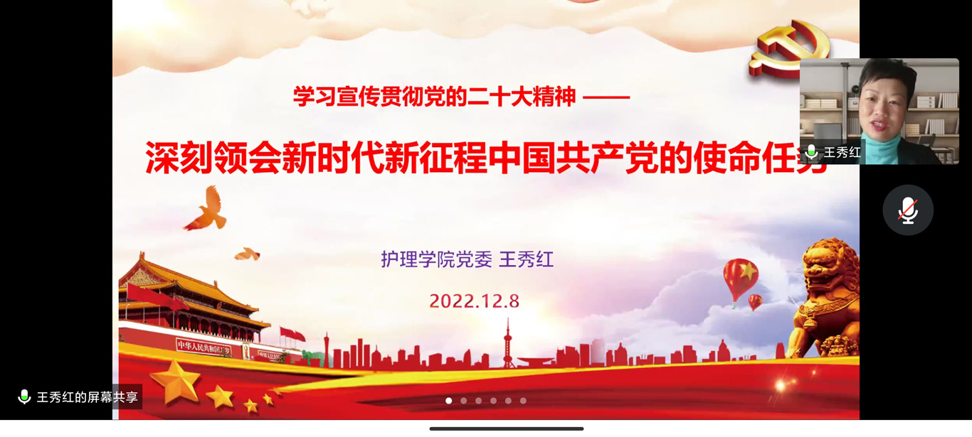 12月8日,为深入学习宣传贯彻党的二十大精神,领悟精神实质。BEAT365英国官网党委委员、副院长王秀红在BEAT365英国官网学生第三党支部以“深刻领会新时代新征程中国共产党的使命任务”为题作了党的二十大精神的宣讲,支部书记刘妍主持会议,支部全体党员参会。