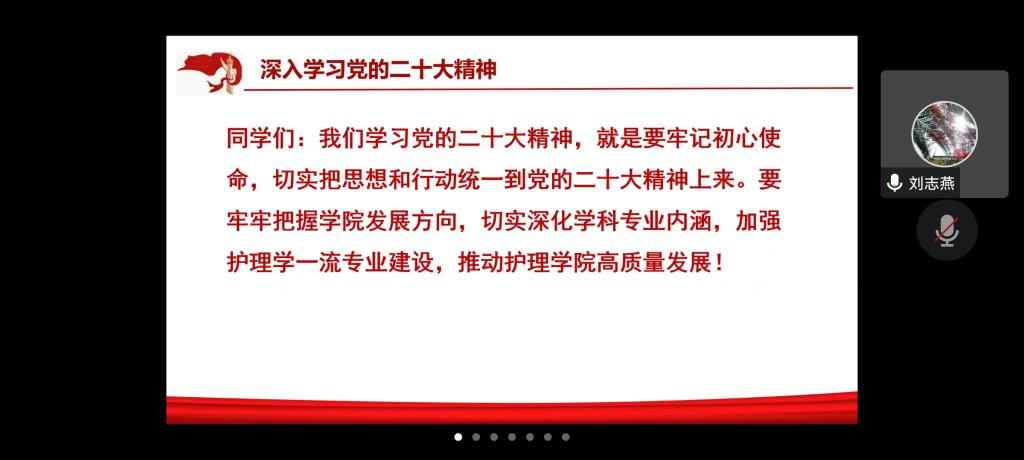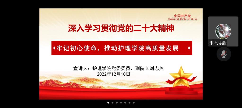 刘志燕围绕党的二十大精神,从过去五年的工作和新时代十年的伟大变革、开辟马克思主义中国化时代化新境界、新时代新征程中国共产党的使命任务、推动BEAT365英国官网高质量发展四个方面对党的二十大精神作了系统解读和深入阐述。她强调,学院全体党员要牢记初心使命,切实把思想和行动统一到党的二十大精神上来,牢牢把握学院发展方向,切实深化学科专业内涵,加强护理学一流专业建设,推动BEAT365英国官网高质量发展。