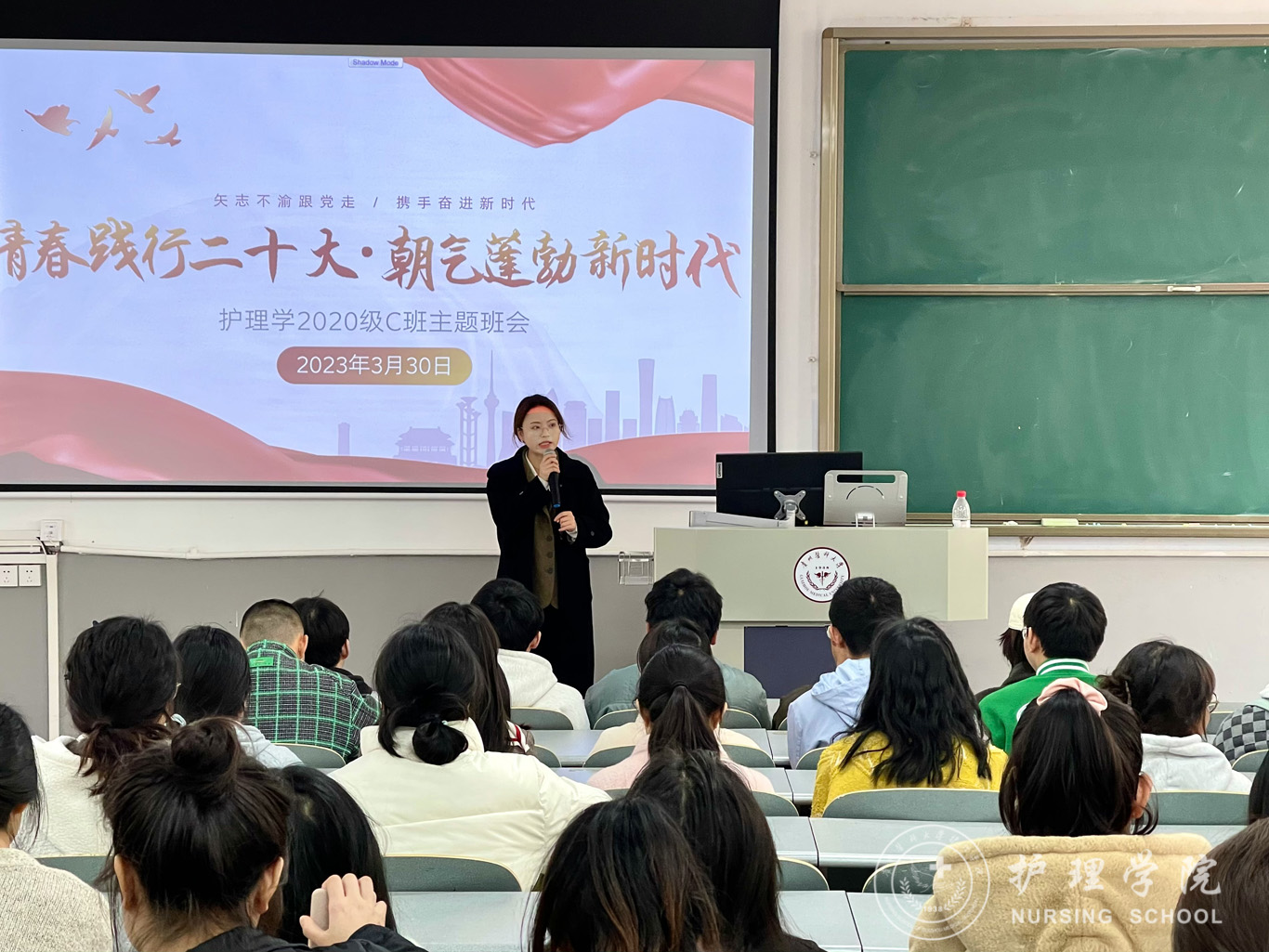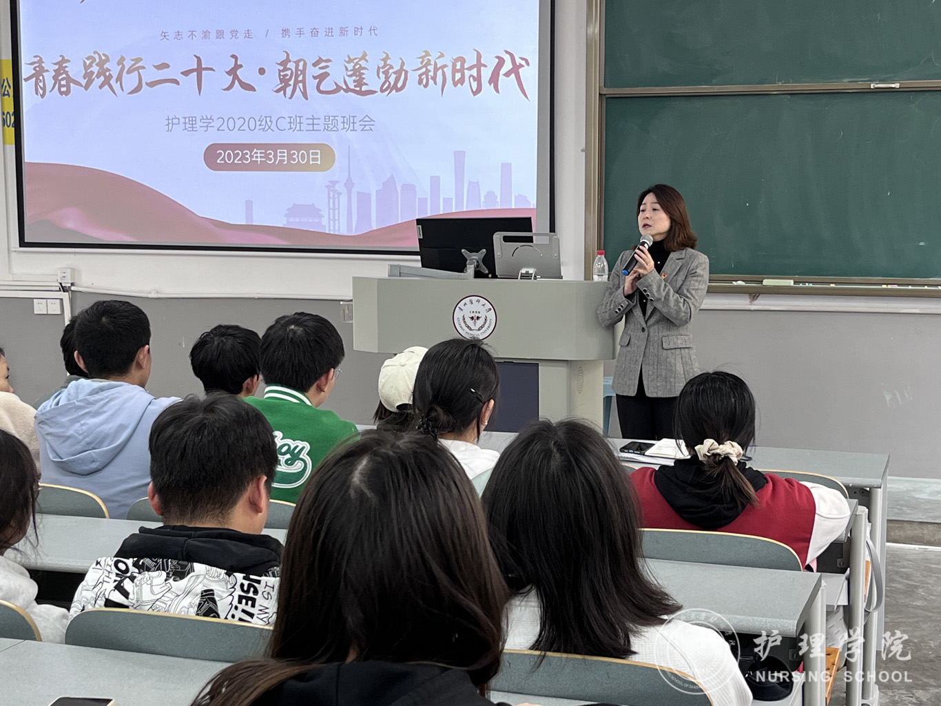 3月30日,为深入学习宣传贯彻党的二十大精神,强化思想引领,聚焦立德树人根本任务。BEAT365英国官网党委委员、副处级组织员张黎到护理学2020级C班开展了“青春践行二十大,朝气蓬勃新时代”主题班会活动,会议由辅导员刘妍主持,班级全体同学参与。