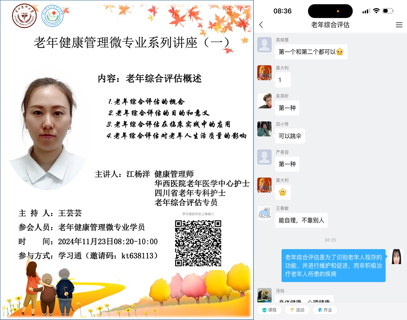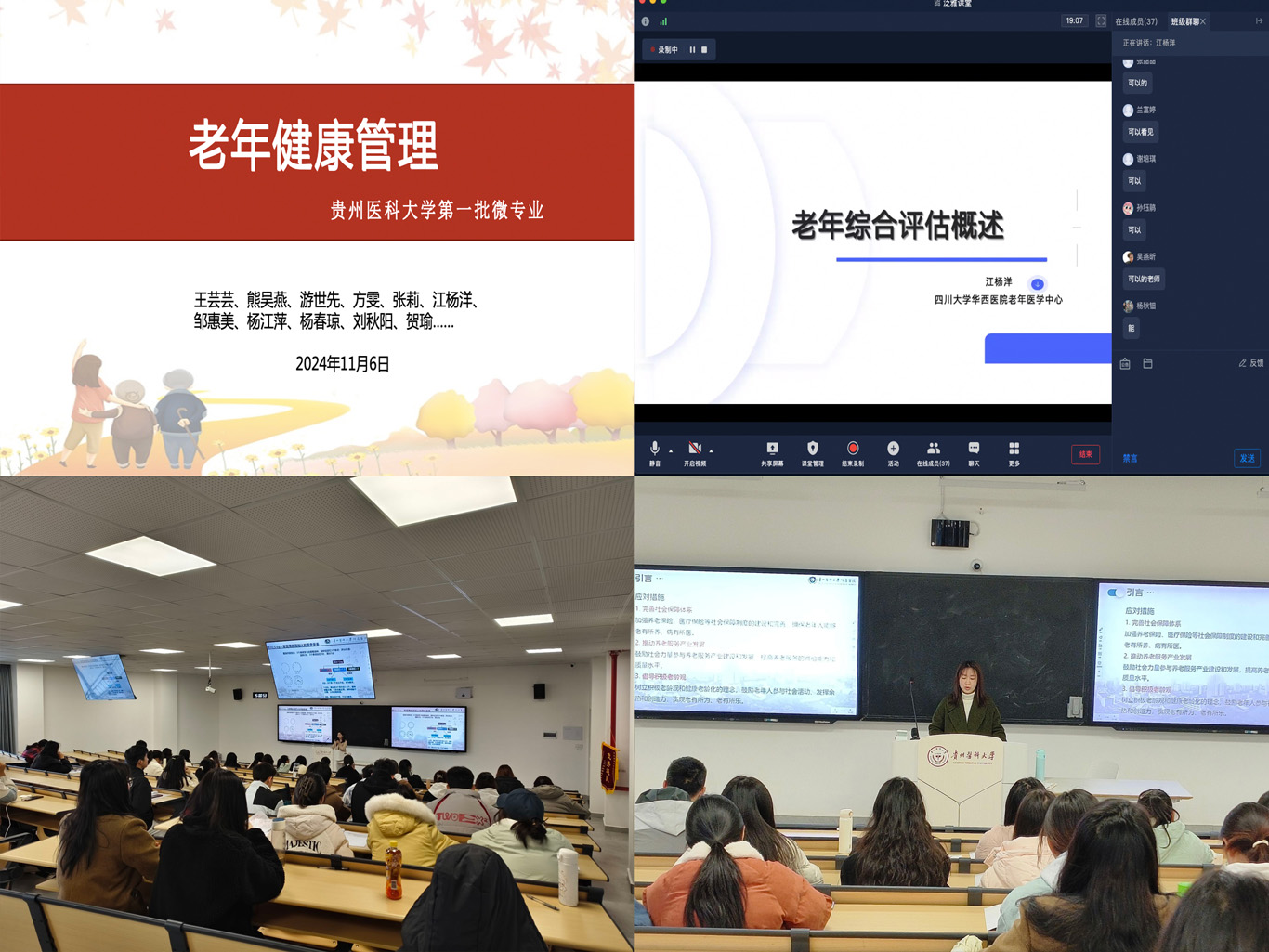 11月6日,老年健康管理微专业正式开课,课程内容涵盖了《老年辅具使用》《养老院的经验与管理》《老年综合评估》等实用科目,授课团队主要由BEAT365英国官网专职教师、南明区晚霞彩带老年人日间照料中心的资深团队成员、附属医院老年医学科医护人员以及四川大学华西医院老年医学中心护士组成。